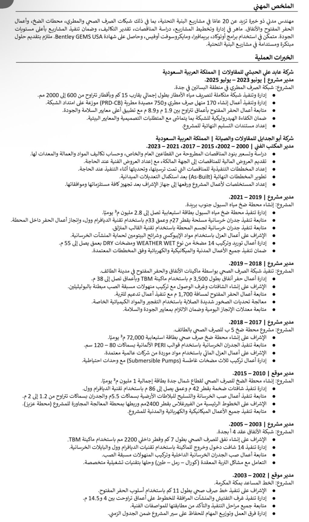 مهندس مدني مدير مشروع حاصل على شهادة PMP خبرة أكثر من 15 سنة، في البنية التحتية (صرف صحي، صرف مطري، محطات رفع - حفر مفتوح) وأيضا مدير مكتب فني قسم الدراسات خبرة واسعة في دراسة المناقصات) الموقع الحالي جدة معتمد في شركة المياه الوطنية