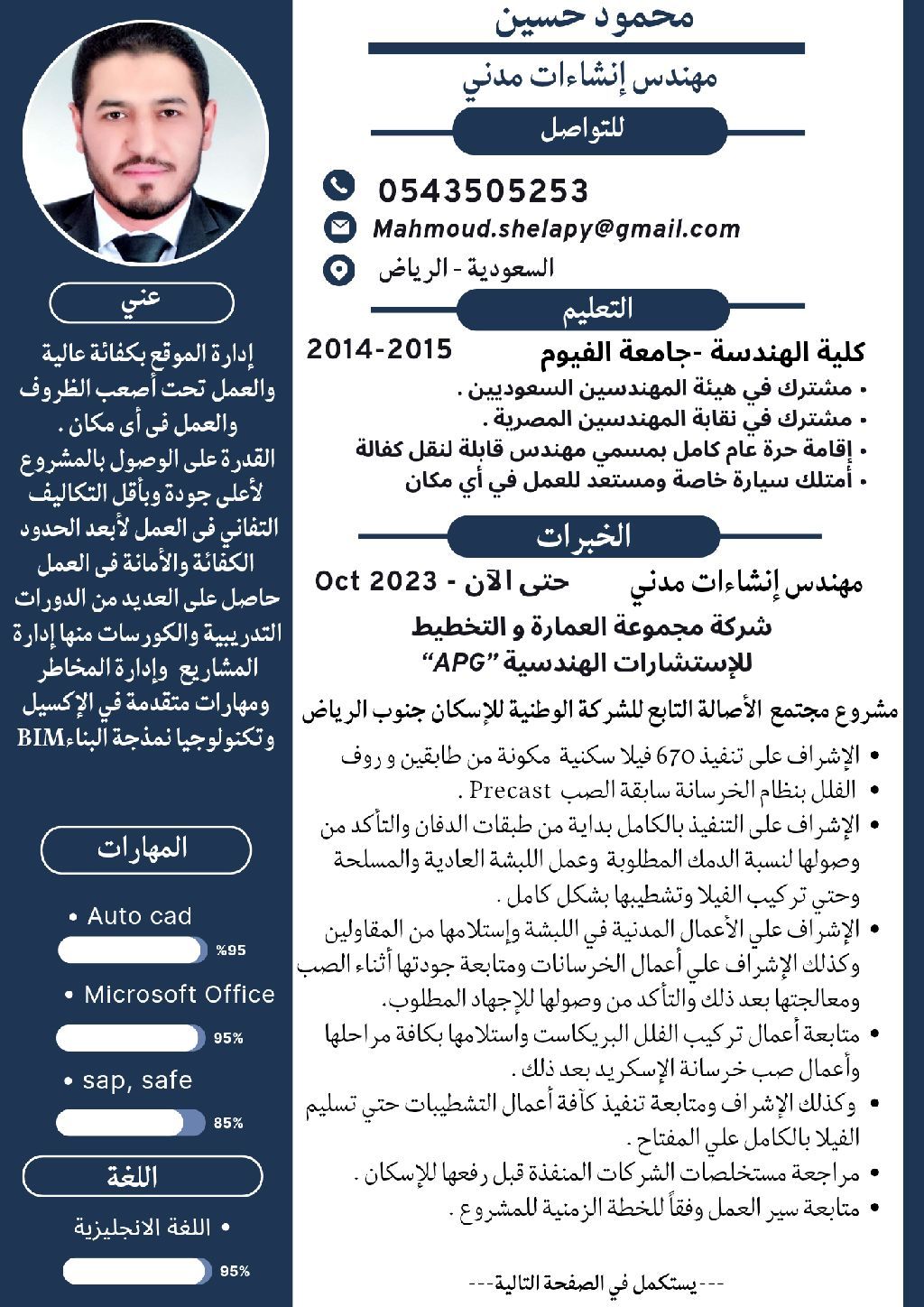 Eng. Mahmoud Hussein, Civil Construction Engineer, more than 10 years of experience in concrete and finishing works, I have a one - year residency permit that can be transferred at any time, I am approved by the Engineering Authority, I have a Saudi driving license and a car, and I have extensive experience in implementing Al - Buraika Set villas, as I supervised the implementation of 670 Al - Buraika
