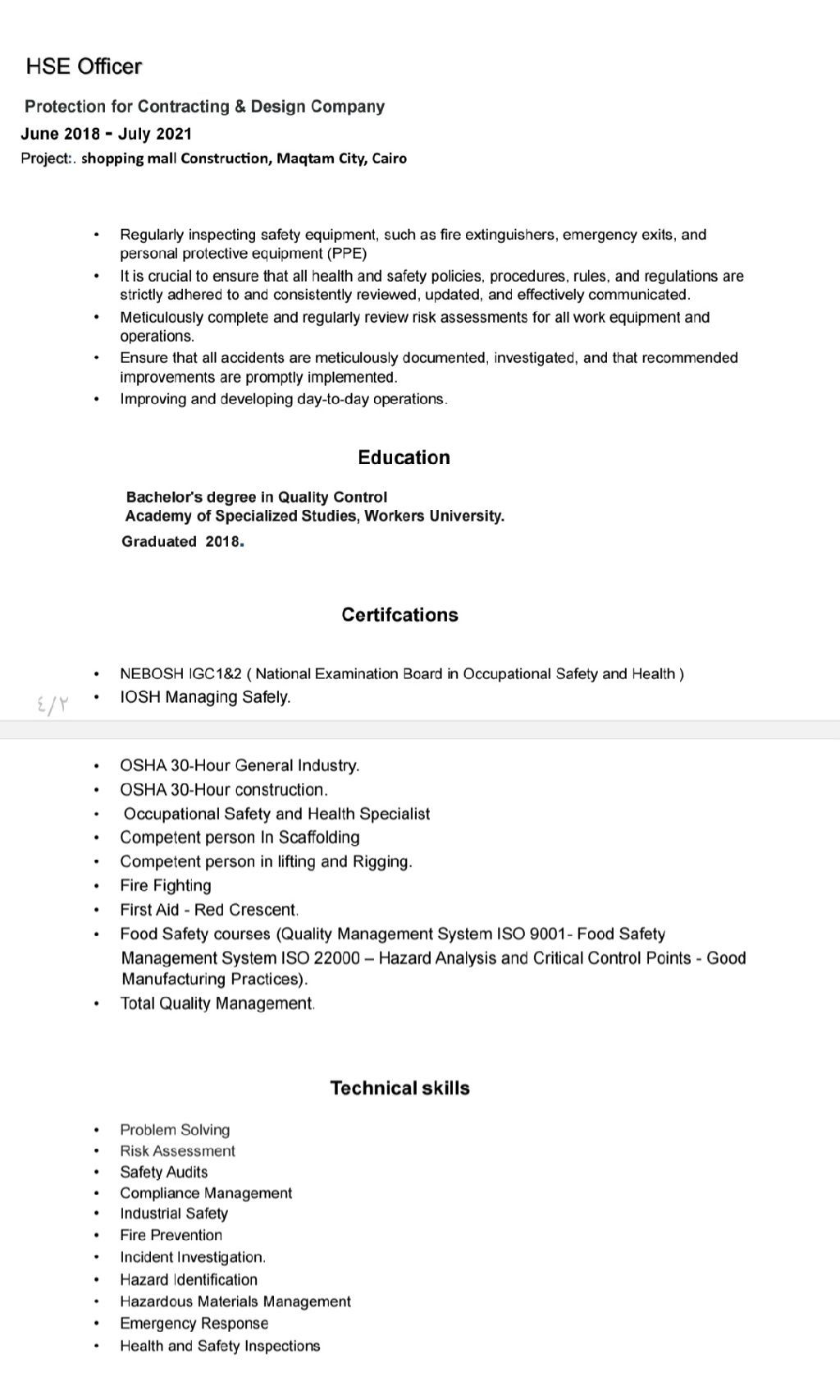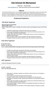 أخصائي/ مشرف سلامة وصحة مهنية خبرة في الانشاءات والصناعات حاصل على اعتماد شركة المياه الوطنية، لدي مهارة في تقييم بيئة العمل، اعداد تقارير السلامة، وتنفيذ اجراءات الوقاية والاستجابة للطوارئ. امتلك قدرة عالية على المتابعة الميدانية والتنسيق مع الجهات الرسمية والتأكد من التزام العاملين بمعايير السلامة حاصل على كورسات دولية مثل NEBOSH, Iosh ms, osha، امتلك خبرة عالية في السلامة والصحة المهنية والبيئة