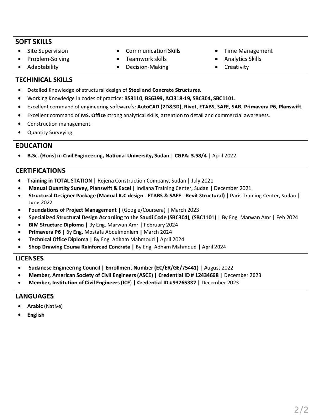 مهندس مدني بخبرة 4 + سنوات في إدارة وتنفيذ المشاريع، التصميم الانشائي، وحساب الكميات، شاركت في تنفيذ مشاريع سكنية وتجارية داخل وخارج المملكة. اجادة استخدام برامج الهندسة وإدارة المشاريع AutoCAD، Revit، ETABS، SAFE، Primavera P6، Planswift. المام تام بالكود السعودي والمواصفات العالمية (ACI - BS - SBC) لدي اقامة سارية قبالة للنقل ورخصة قيادة متواجد في الرياض