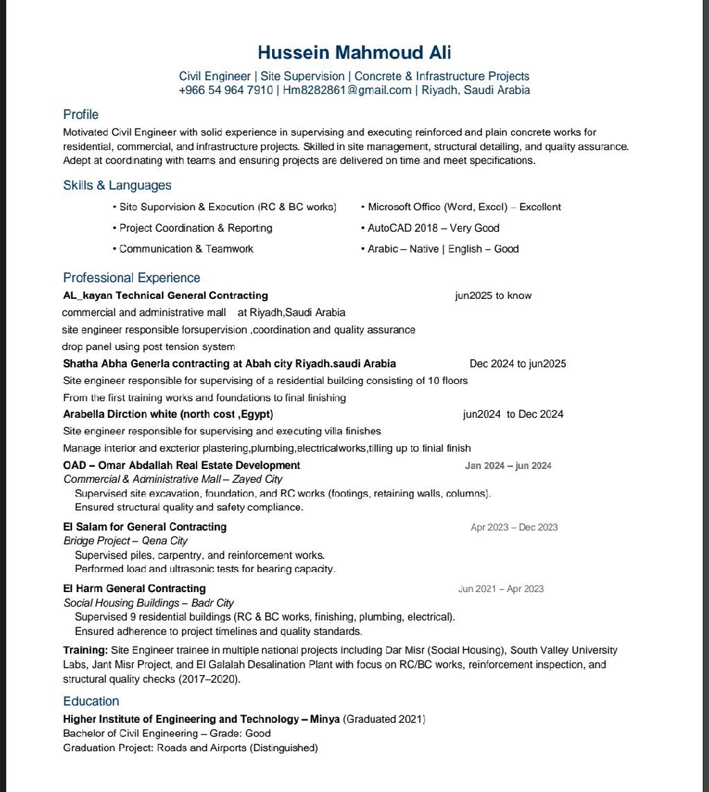 مهندس مدني خبرة 4 سنوات خبرة في الخرسانات والتشطيبات مولات وفلل وعمارات وشاليهات إقامة سارية لمدة عام متواجد في مكة إقامة سارية لمدة عام جاهز لنقل كفالة جاهز للعمل في أي مكان في المملكة