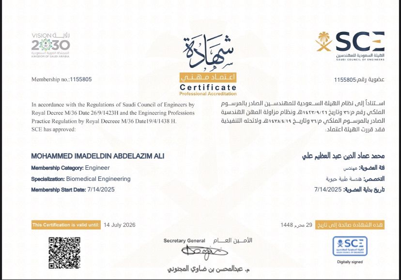 Professional biomedical engineer licensed by the Saudi Council of Engineers, experienced in maintenance, calibration, and installation of medical equipment. Available for work across all cities in Saudi Arabia