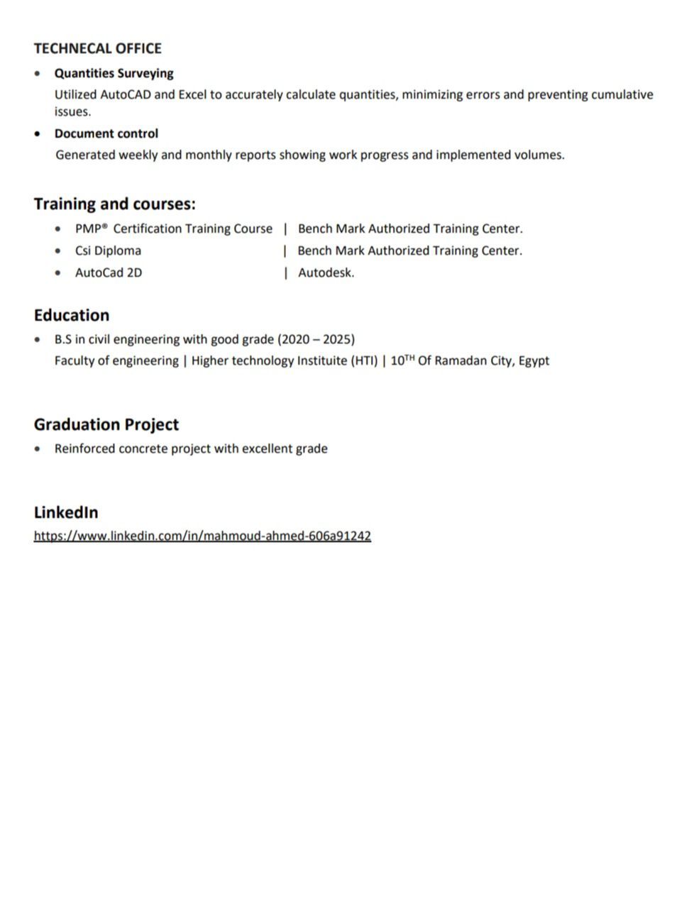 I am a 24 - year - old Egyptian civil engineer seeking a suitable job opportunity as a site civil engineer or concrete/ finishing supervisor. I have one year of experience (summer internships during my studies + full time work) I currently reside in Jeddah, Saudi Arabia and am ready to start immediately anywhere in the Kingdom