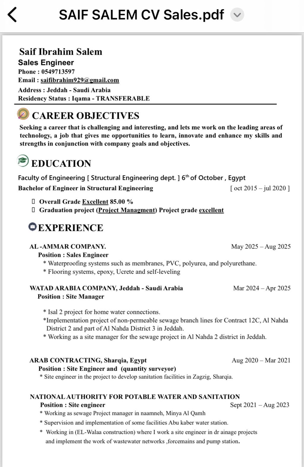 مهندس مدني خبرة 6 سنوات متواجد حاليا في جدة خبرة في البنيه التحتية ومهندس مبيعات للتواصل