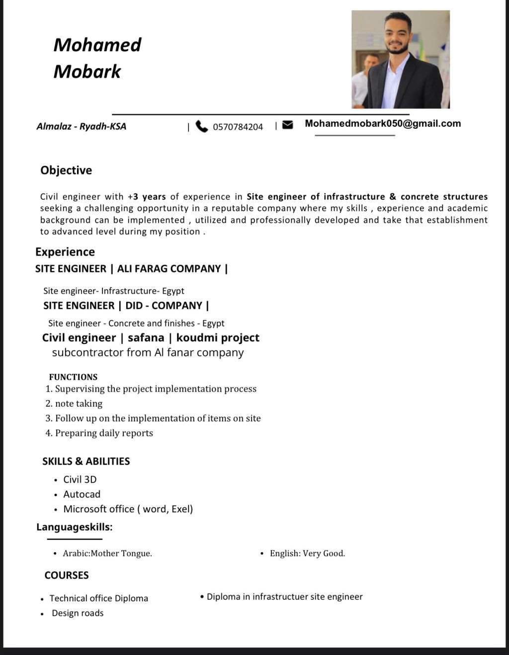 محمد مبارك / مهندس مدني (مصري) خبرة ثلاث سنوات في مجال التشطيبات والخرسانات وعلى دراية بأعمال البنية التحتية / عملت بالمملكة العربية السعودية في مشروع محطة كهرباء الكودمي في جازان