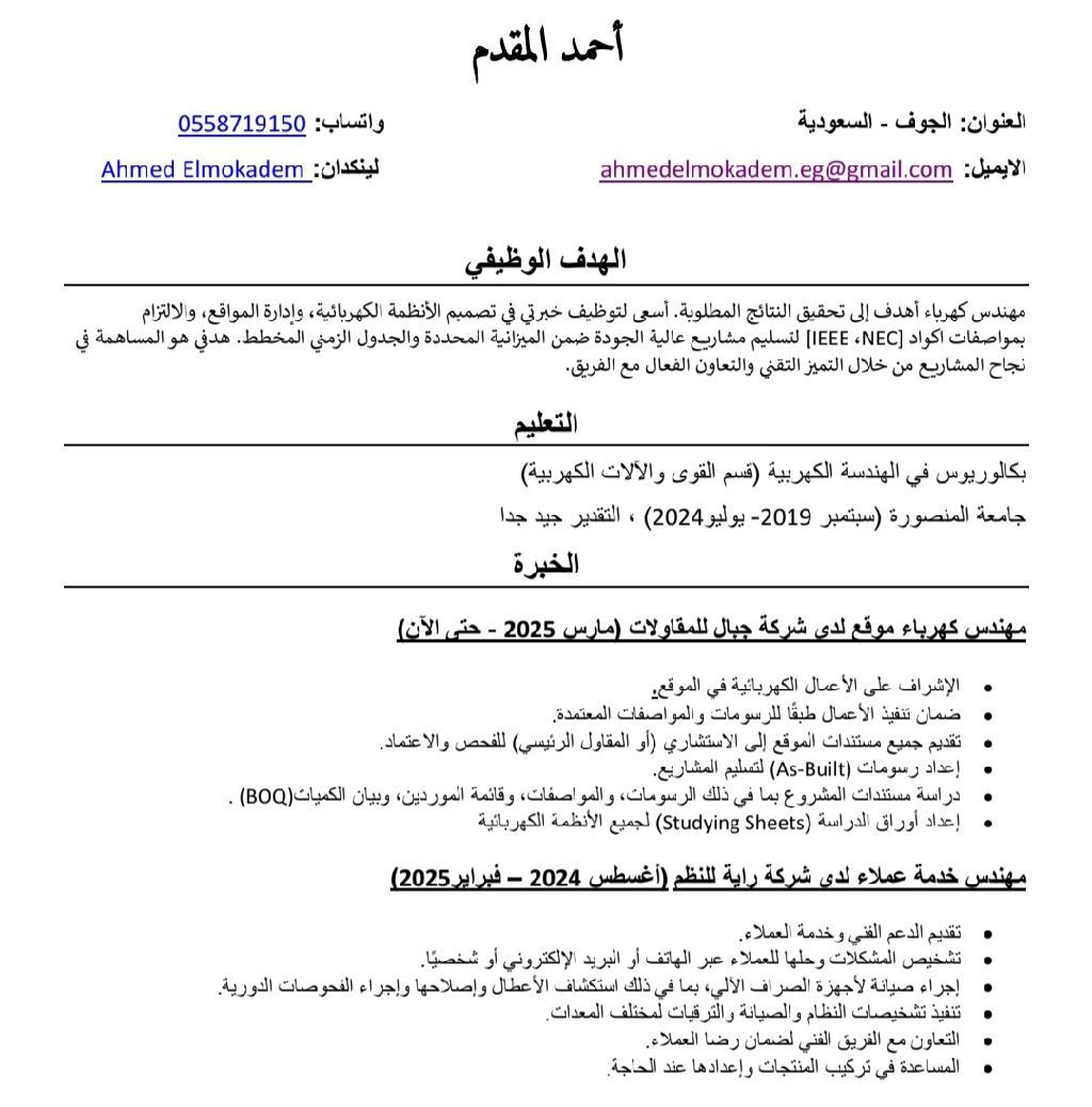 مهندس كهرباء مصري لدى خبرة كمهندس موقع في السعودية وأجيد أعمال التصميم والحصر والشوب درووينج على برامج الاوتوكاد وديالكس ايفو وبرامج مايكروسوفت أوفيس. لغتي الانجليزية ممتازة. متواجد في المملكة ولدي اقامة سارية. ابحث عن فرصة عمل مناسبة