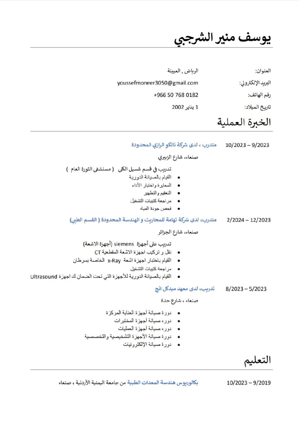 Medical Equipment Engineer, Bachelor's degree, Yemeni nationality, looking for a job opportunity as a medical equipment technician, medical equipment sales department, or electronics technician