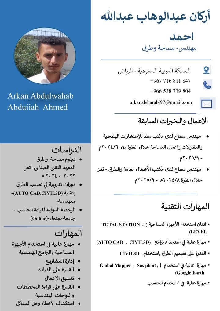 General Surveyor Experience in Roads and Infrastructure Projects I am good at working on surveying devices (Level - totlstation) and engineering programs (Civl 3D - AutoCAD - sasplant - Googel Earth - global Mapper) and all Windows Microsoft programs I am looking for a job opportunity I am currently located in Riyadh region Yemeni nationality I am good at reading engineering drawings and boards