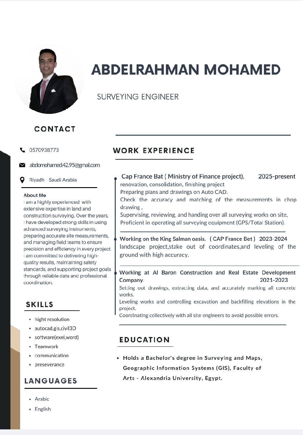 Senior survey. Site administrator. Working on all surveying equipment and programs. Full responsibility for the site and coordination with other site engineers. Working on all items with high accuracy, including surveying, signing, and leveling work