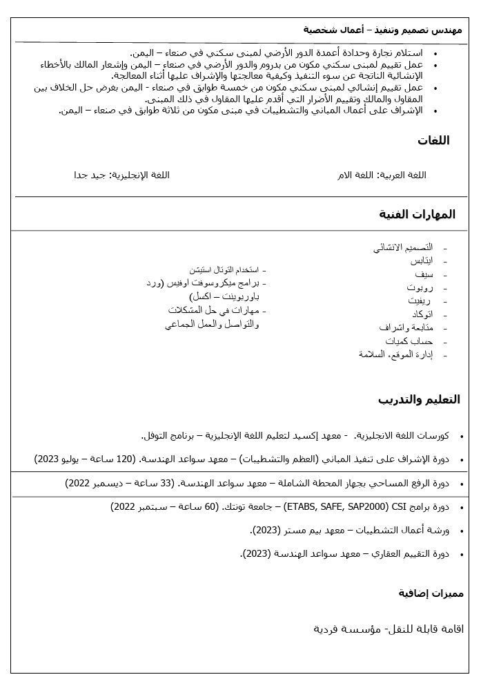 I am a civil engineer looking for a job and I have three years of experience (within Saudi Arabia and without it) in the field of civil engineering ( I e structural design, engineering supervision, preparation of engineering reports, and quantity surveys) I skilfully use structural engineering software and enjoy a good understanding of engineering codes and Building standards