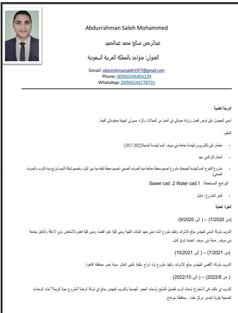 مهندس مدني مصري خريج جامعة حكوميه بني سويف مقيم في المملكة خبرة 3 سنوات في الخرسانات والتشطيبات كل البنود سابق أعمال في المملكة السعودية (تنفيذ وبناء مسجد الفخم بمحطة السهم في جدة) تنفيذ وبناء مسجد وغيداء صالح وبسيم بمحطة ساسكو طريق الدمام الرياض) تنفيذ وبناء مسجد سد أيا بمحطة بترومين طريق المدينة جدة