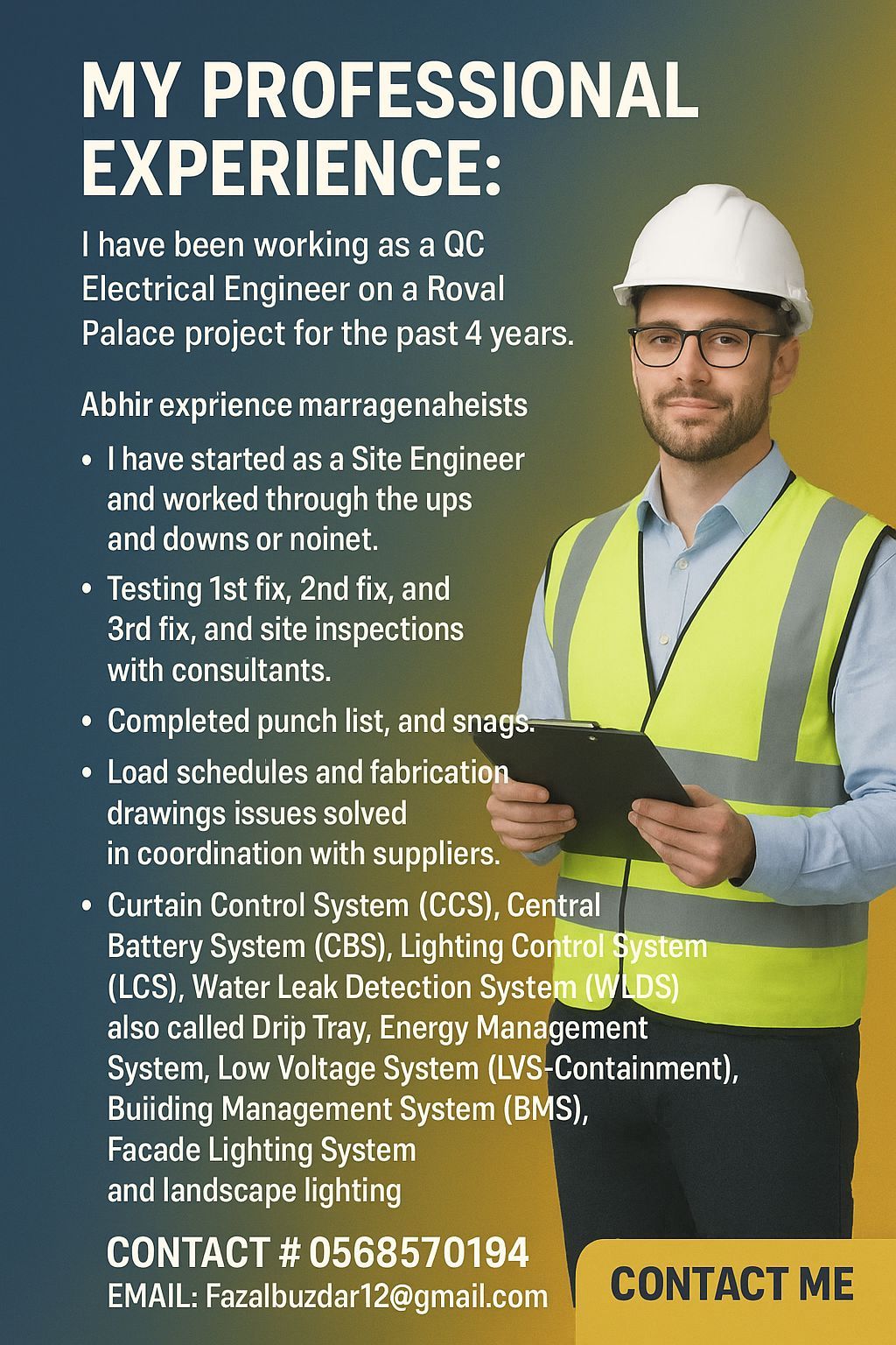 Professional Experience A dedicated QC Electrical Engineer with five years of experience working on a Royal Palace project from start to handover. Skilled in site supervision, coordination, testing (1st - 3rd fix) and documentation. Proficient in handling systems like CCS, CBS, LCS, WLDS, EMS, LVS, BMS, Facade & Landscape Lighting with strong problem - solving and consultant coordination expertise