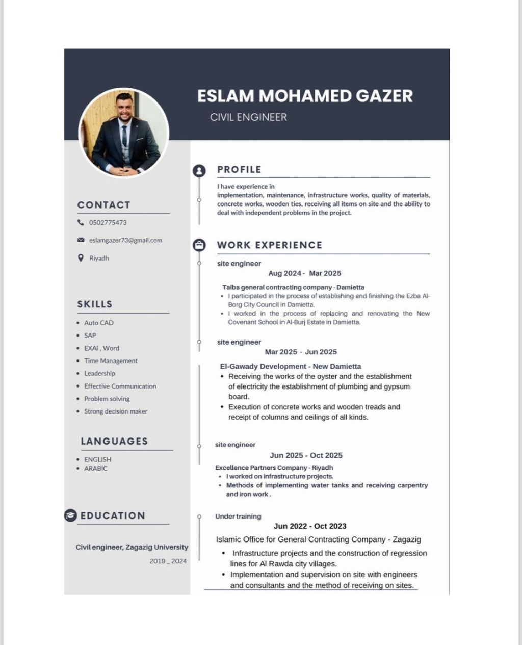 مهندس مدني خبرة سنة واحدة عملت 6 شهور في البنيه التحتية و5 شهور في المنشاءات