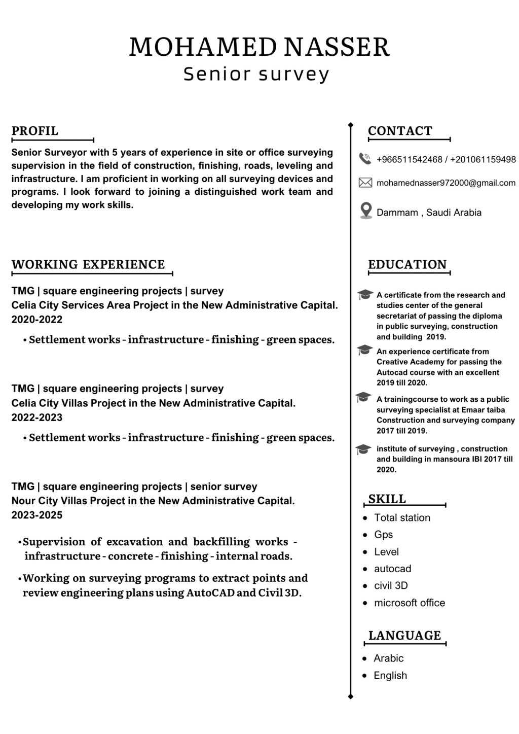 مساح خبرة 6 سنوات موقع ومكتب في مجال الانشاءات والتشطيبات والطرق وأعمال التسويات والبنية التحتية واللاند سكيب أجيد العمل علي جميع الاجهزة والبرامج المساحية متاح للعمل في أقرب وقت وفي أي مكان