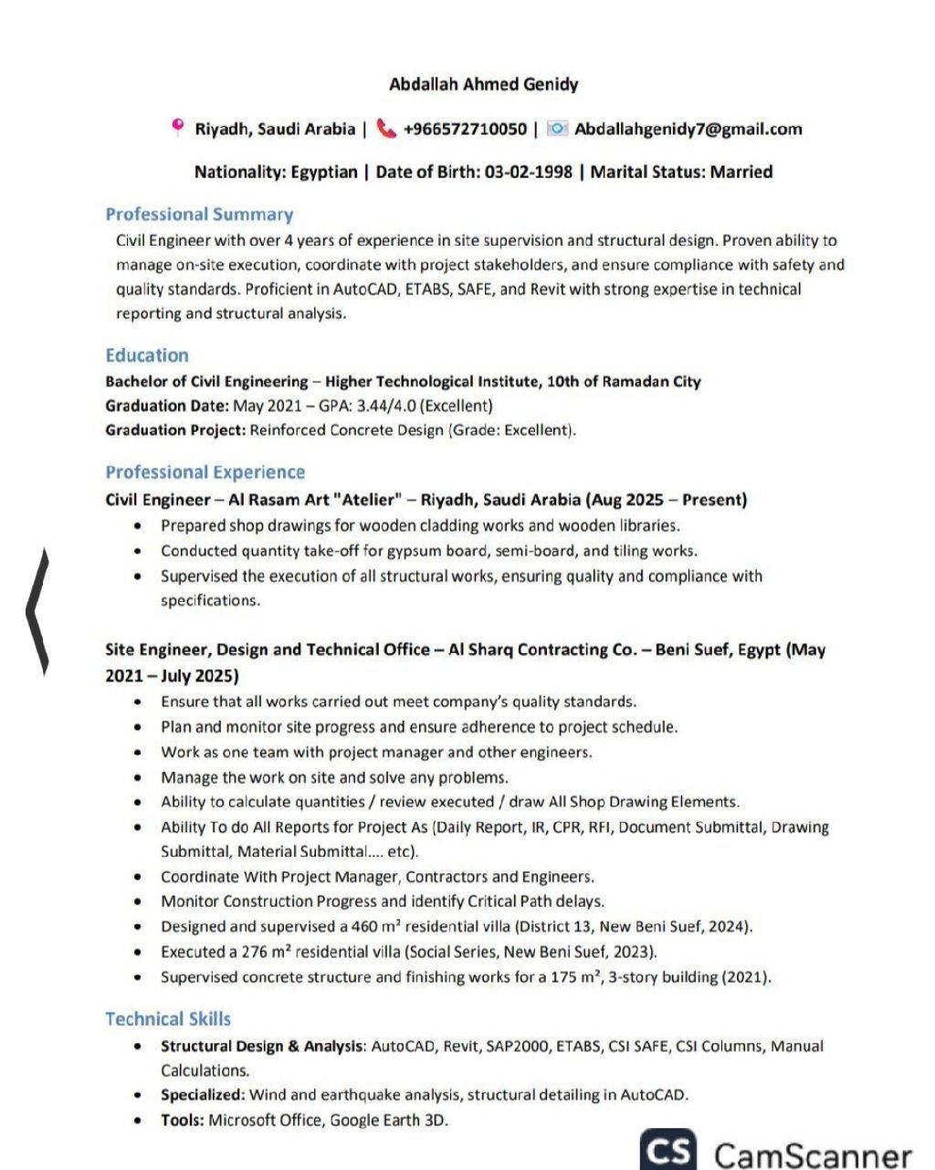 مهندس مدني خبرة 5 أعوام في التنفيذ والتصميمات الهندسيه والتشطيبات مشهود لي بالكفاءة في العمل من جه المديرين السابقين علي خبرة ببرامج التصميم والسيف والساب والايتابس والريفت والبروما فير وسيفل بالاضافة الى برنامج الاوتوكاد ودراسة تأثير الرياح والزلازل للمنشاءات اعمل علي تنفيذ وتصميم مشروعات الفلل والمباني العالية ومراعات التصميمات المعمارية وذلك طبقا الكود السعودي وعملت لدي شركة مفن الرسام في الريا