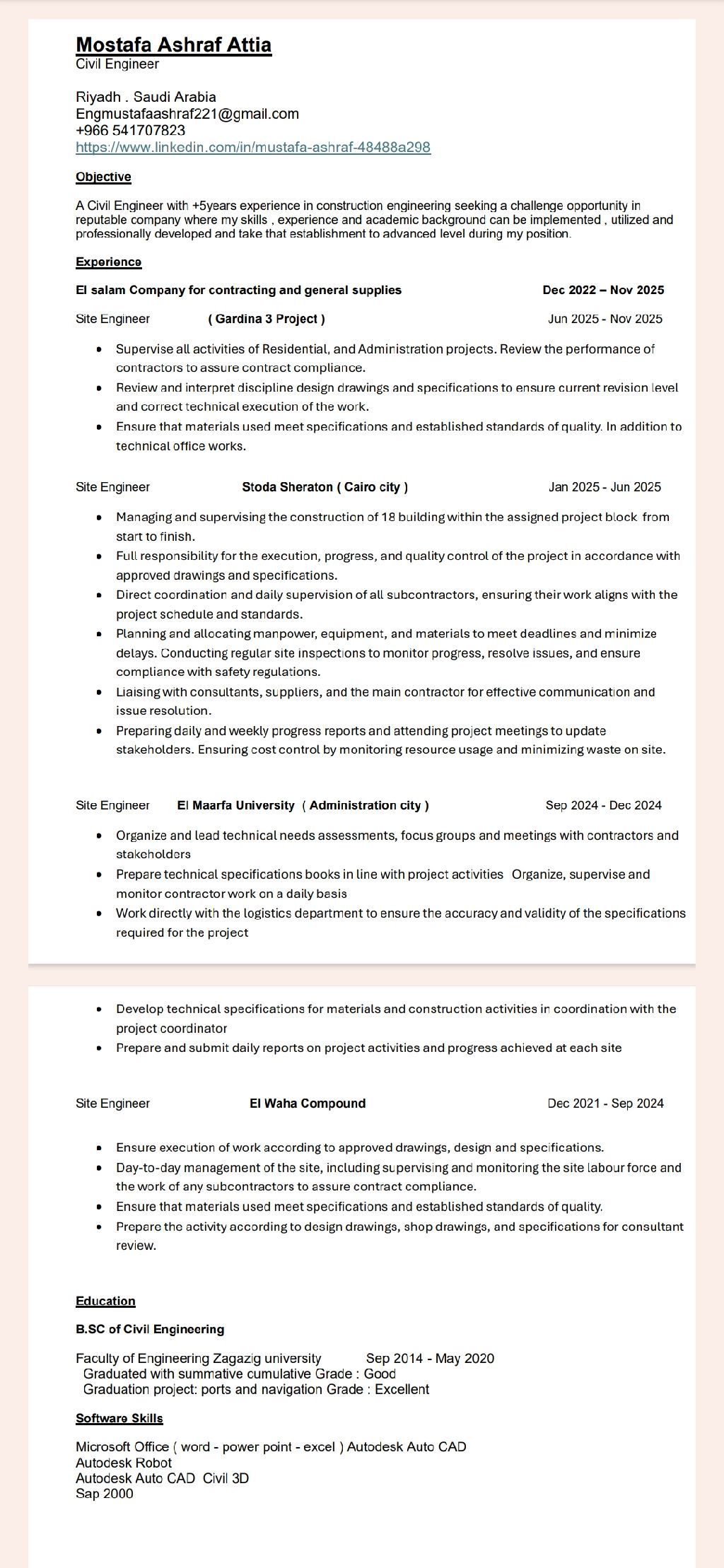 مهندس مدني موقع خبرة 5 سنوات خرسانات وتشطيبات وحصر كميات معتمد في هيئة المهندسين السعوديين إقامة سارية مقيم في الرياض وجاهز للعمل في أي مكان في المملكة