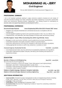 مهندس مدني من اليمن مقيم في الرياض حاليا لدي خبرة جيدة في التصميم بحسب الكود السعودي، وأجيد استخدام كافة البرامج الهندسية ETABS - SAFE - SAP2000 - Robot - Civil 3D - Revit - Primavera كما لدي خبرة عملية حساب الكميات والأعمال المساحية واستخدام اجهزة المساحة مثل الليفل، الثيودوليت، التوتال ستيشن وGPS. أتمتع بقدرة على التخطيط وتنظيم المشاريع، ومتابعة تنفيذ الأعمال وضمان جودة الأداء