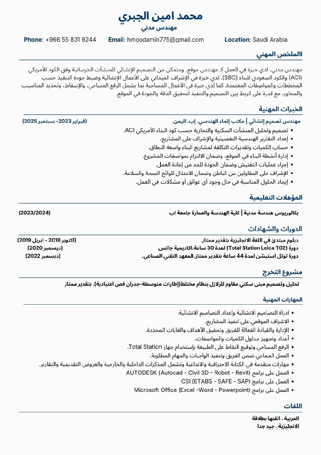 مهندس مدني اشراف موقع وحساب كميات متاح فورا مقيم في الرياض خريج 2023 / 2024، خبرة عملية في الاشراف الموقعي ومتابعة التنفيذ واستلام الأعمال وحساب الكميات والأعمال المساحية بدقة. أجيد استخدام ETABS وSAFE وSAP2000 وCivil 3D وAutoCAD واستخدام الاجهزة المساحية Level وTotal Station وGPS. امتلك رخصة قيادة وإقامة سارية، ومتحمس للعمل فورا والمساهمة في نجاح المشاريع بأي مدينة داخل المملكة
