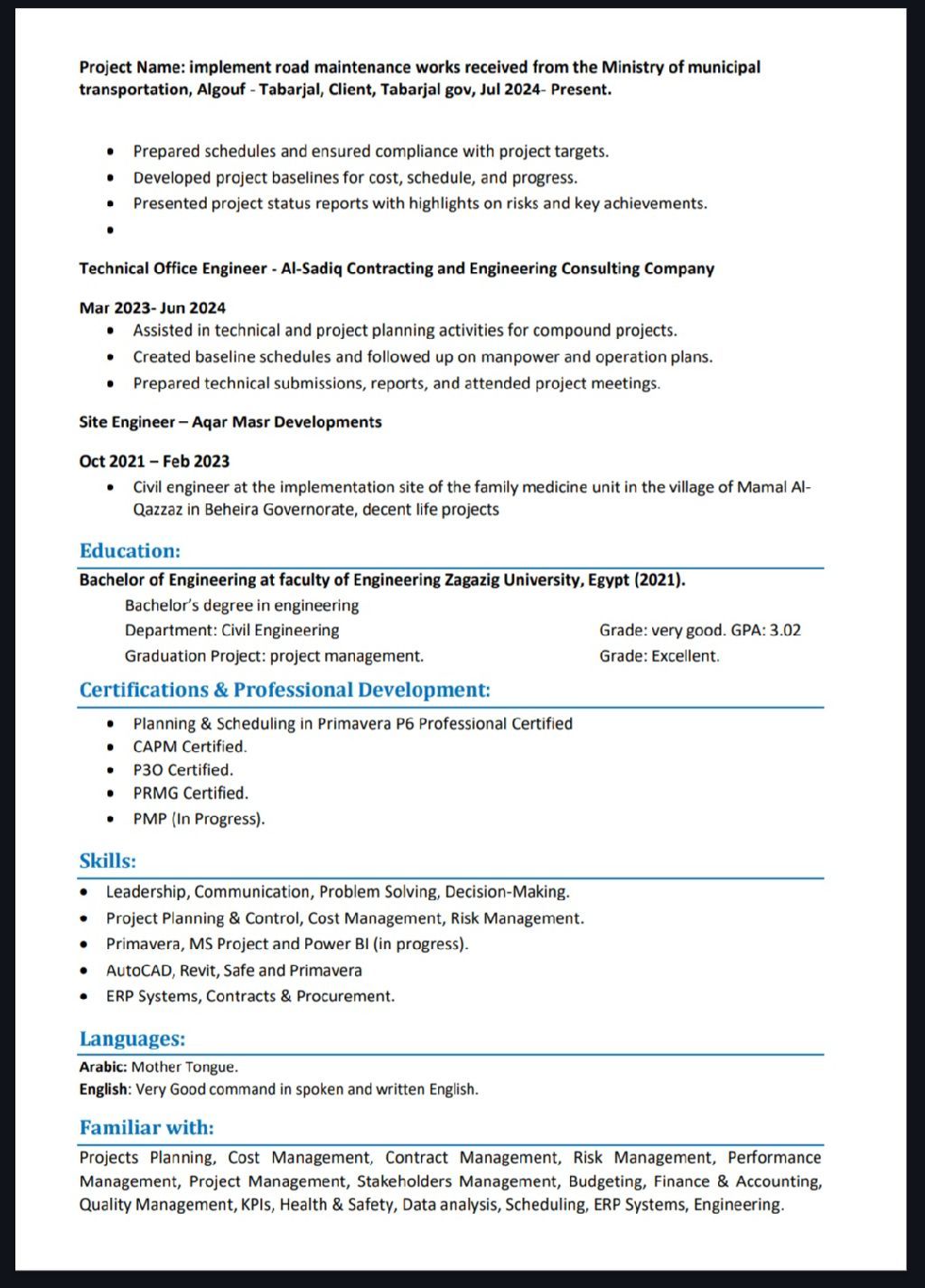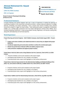 Planning engineer with 5 years of experience in construction, infrastructure, and national power and water projects. Holds CAPM, P3O, and PRMG certifications. Valid residency permit and Saudi driver's license