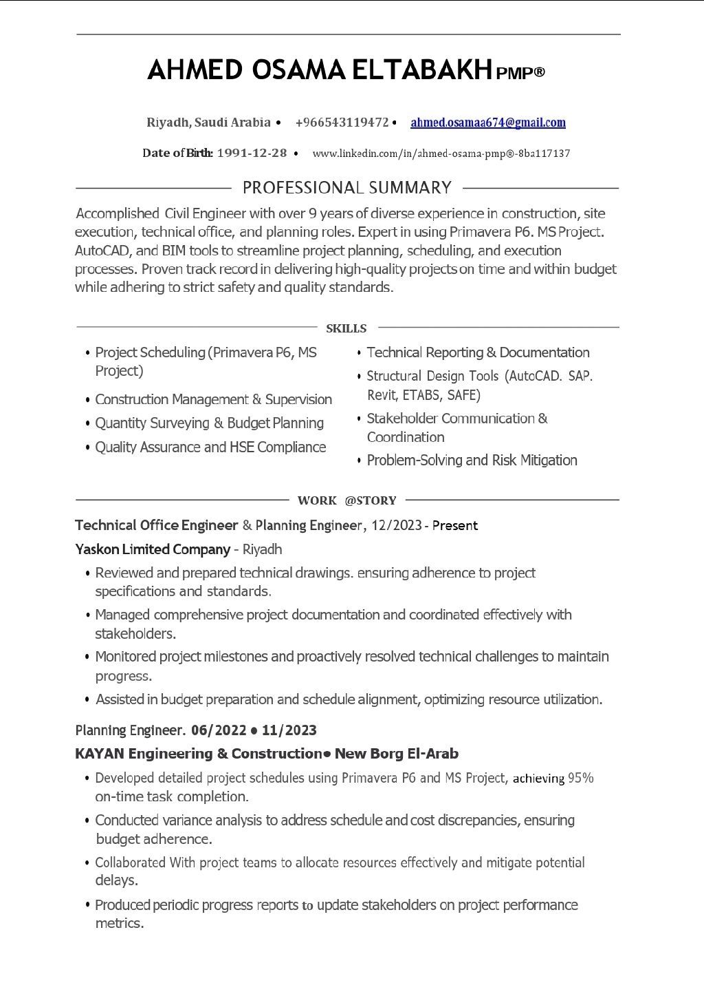 Civil Engineer with 9 of experience seeking an opportunity in Riyadh in Construction, Planning, Technical Office, Inspection, or Quality roles. Experienced in site supervision, progress monitoring, QA/ QC, preparing progress reports and schedules (Primavera) coordinating parties, and risk analysis. Certifications PMP, RMP, PMI - SP, ISO 9001