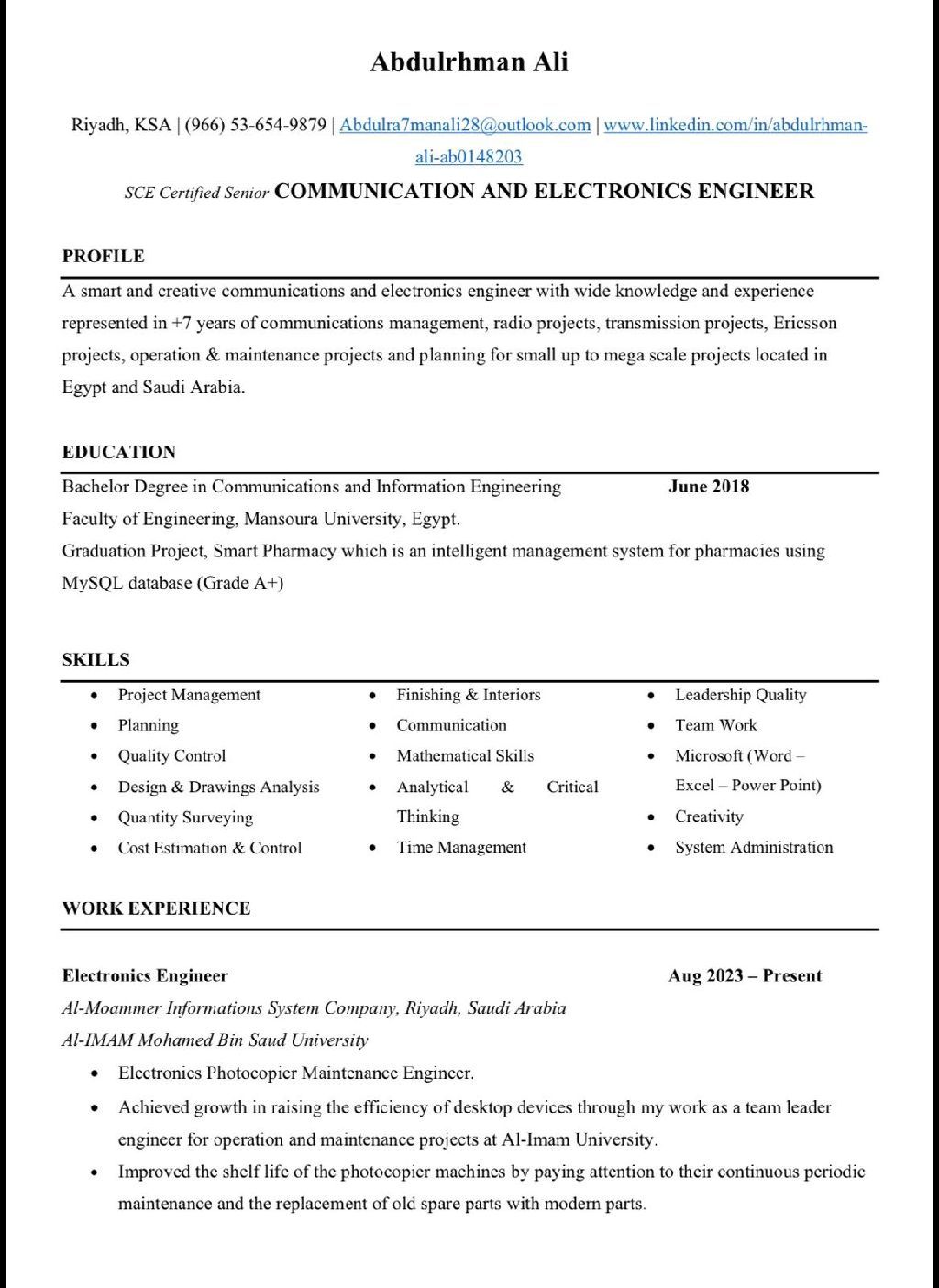مهندس اتصالات والكترونيات عضو بالهيئة السعودية للمهندسين خبرة أكثر من 8 سنوات في عدة مجالات (أبراج الموبايل وال it والشبكات والطابعات والاجهزة المكتبية) وخبرات اضافية في مجال تنسيق وادارة المشاريع مقيم في الرياض لدي رخصة سارية وإقامة سارية قابلة للتحويل