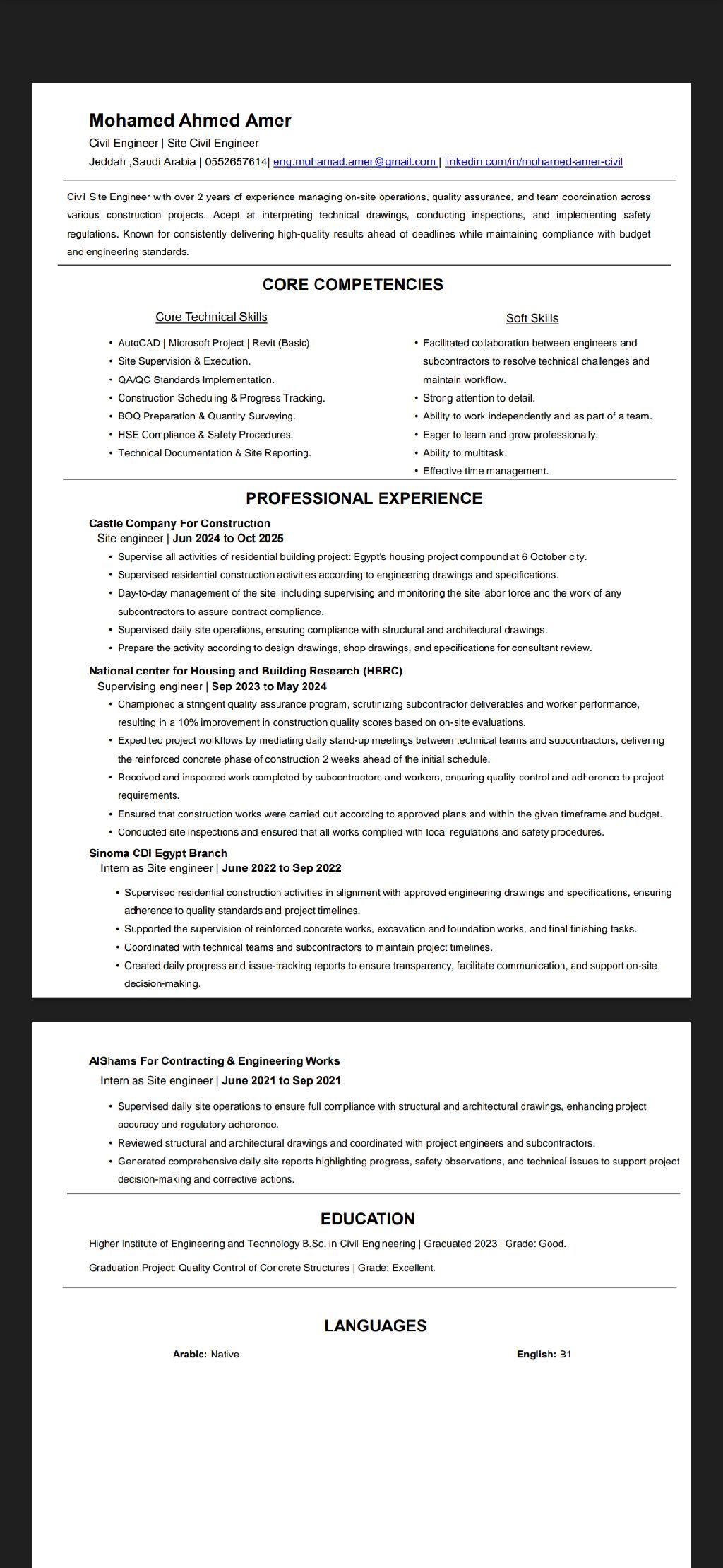 مهندس مدني تنفيذ خبرة ثلاث سنوات في مواقع التنفيذ وأجيد برنامج AutoCAD وبرامج Microsoft office واشراف على الأعمال الانشائية، متابعة البنود، تسليم الأعمال، واعداد التقارير اليومية وفق المخططات أملك إقامة سنة وأجيد السواقة