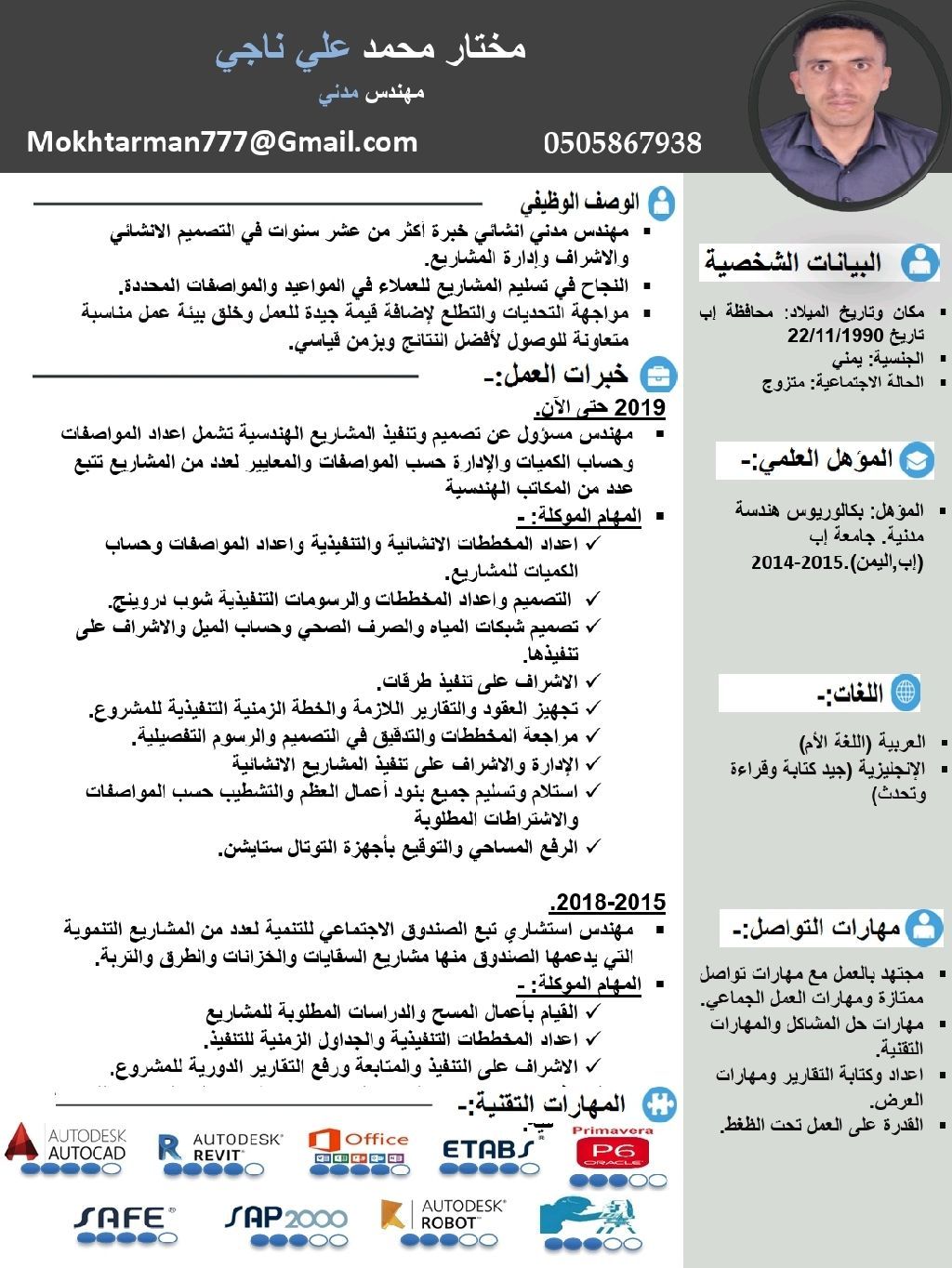 مهندس مدني، خبرة 10 سنوات في مجال التصميم والاشراف الهندسي والتنفيذ ورفع التقارير الهندسية والمستخلصات واعداد الدراسات وحساب الكميات واعداد الدراسات الفنية والمالية للمشاريع متاح نقل كفالة