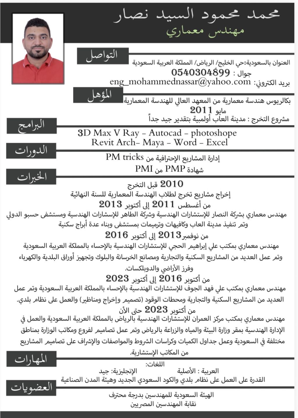 مهندس معماري متواجد داخل الرياض خبرة 14 سنة منها 12 سنة داخل السعودية حاصل على PMP واجادة جميع البرامج الهندسية والتسعير وحصر الكميات وتصميم المباني (سكني - تجاري - صناعي - اداري - حكومي - صحي)