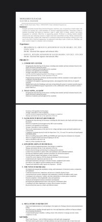 مهندس كهرباء خبرة أربع سنوات في الرياض، اشتغلت في البولفار (السعودية زون، الميجا استوديو، البيتا ورلد، ذا فينيوا) اشتغلت في الاسكان (520 في الدمام، مول المركز المجتمعي)