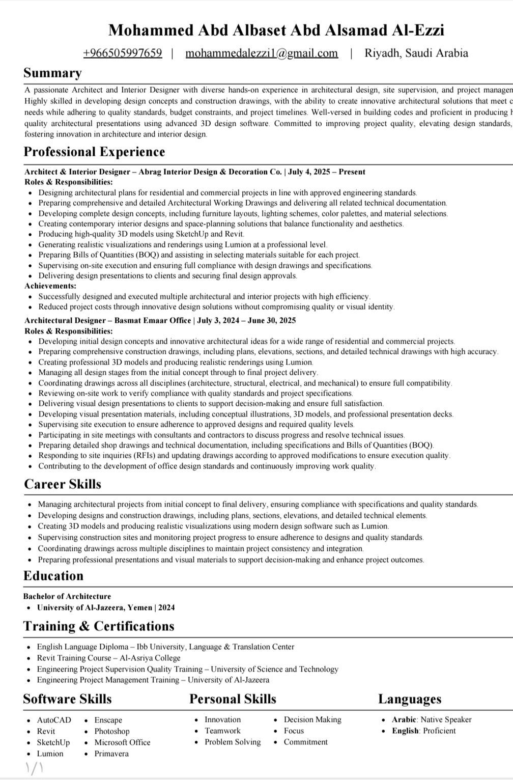 I am an architect working in architecture. I have experience in architectural supervision and design, and I am able to handle work pressure