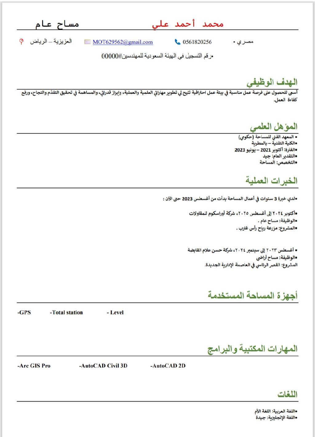 مساح عام خريج معهد مساحة حكومي عضو لدى الهيئة السعودية للمهندسين أتقن العمل على جميع الاجهزة level, Total station, Gps والبرامج Atou Cad 2d, civil 3d