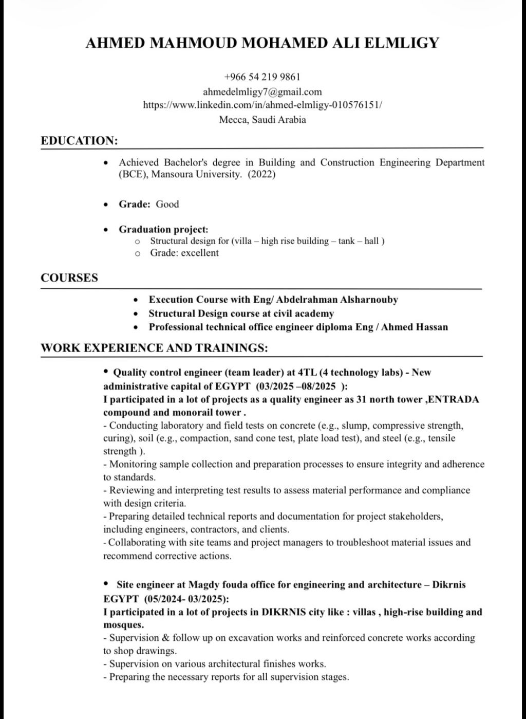 مهندس مدني خبرة 4 سنوات في تنفيذ واستلام بنود الخرسانات والتشطيبات وعلي دراية بأعمال حصر الكميات والمستخلصات. يوجد إقامة سنة وجاهزة النقل وعلي استعداد للعمل بأي مكان في المملكة