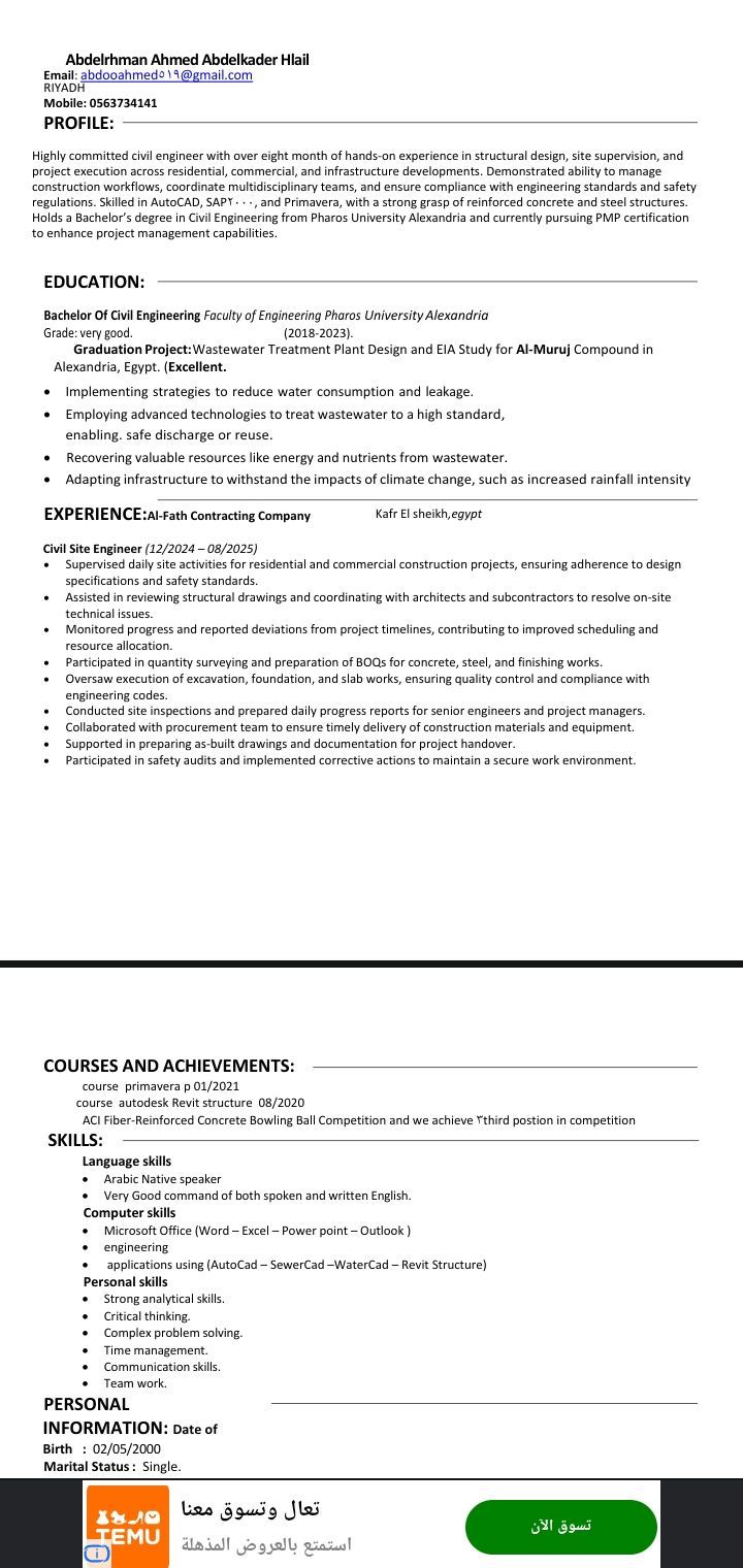 Civil engineer with over eight month of hands - on experience in structural design, site supervision, and project execution across residential, commercial, and infrastructure developments. Demonstrated ability to manage construction workflows, coordinate multidisciplinary teams, and ensure compliance with engineering standards and safety regulations. Skilled in AutoCAD, SAP2000, an