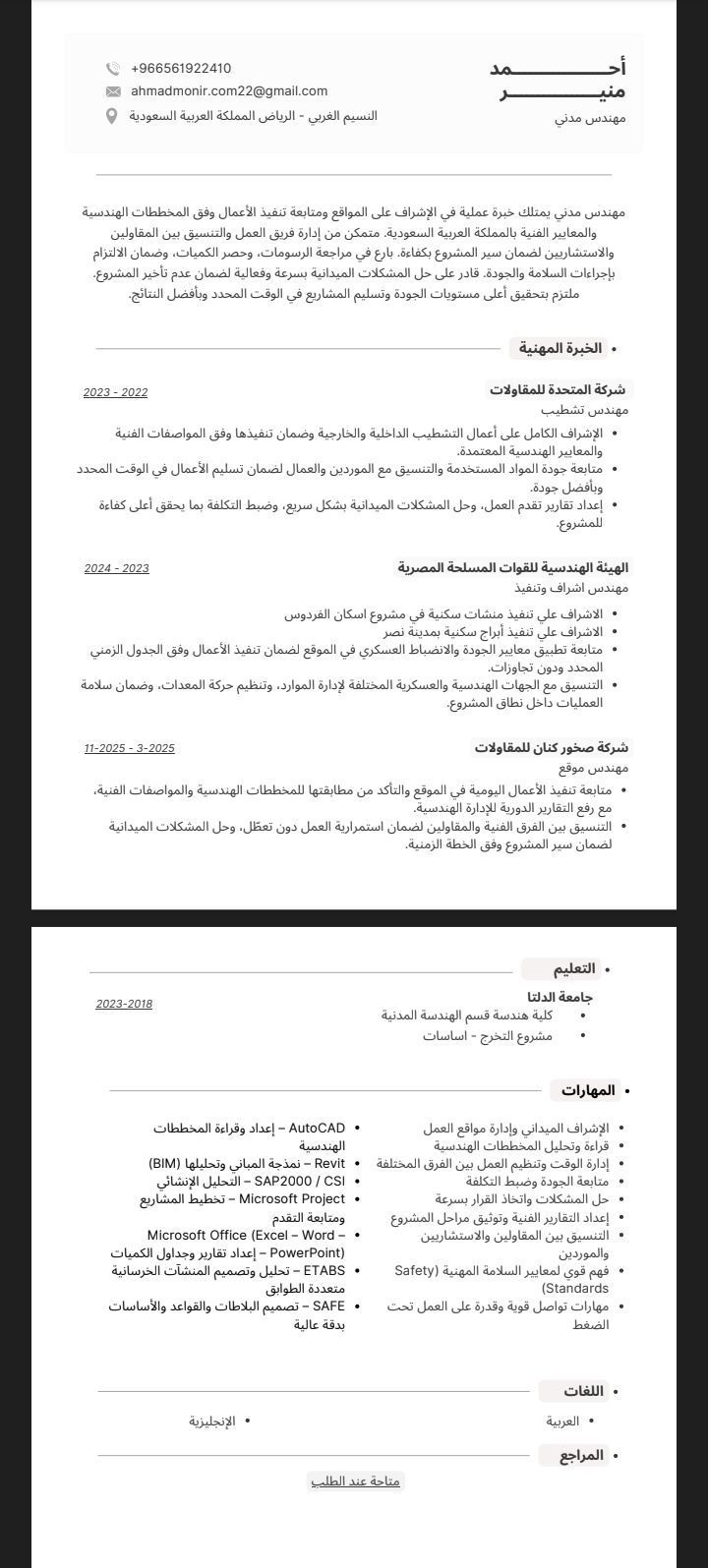 مهندس مدني خبرة 3 سنوات في تنفيذ الفلل والمباني أعمال (الخرسانة والتشطيبات) السكنية مقيم في الرياض جاهز لنقل الكفالة