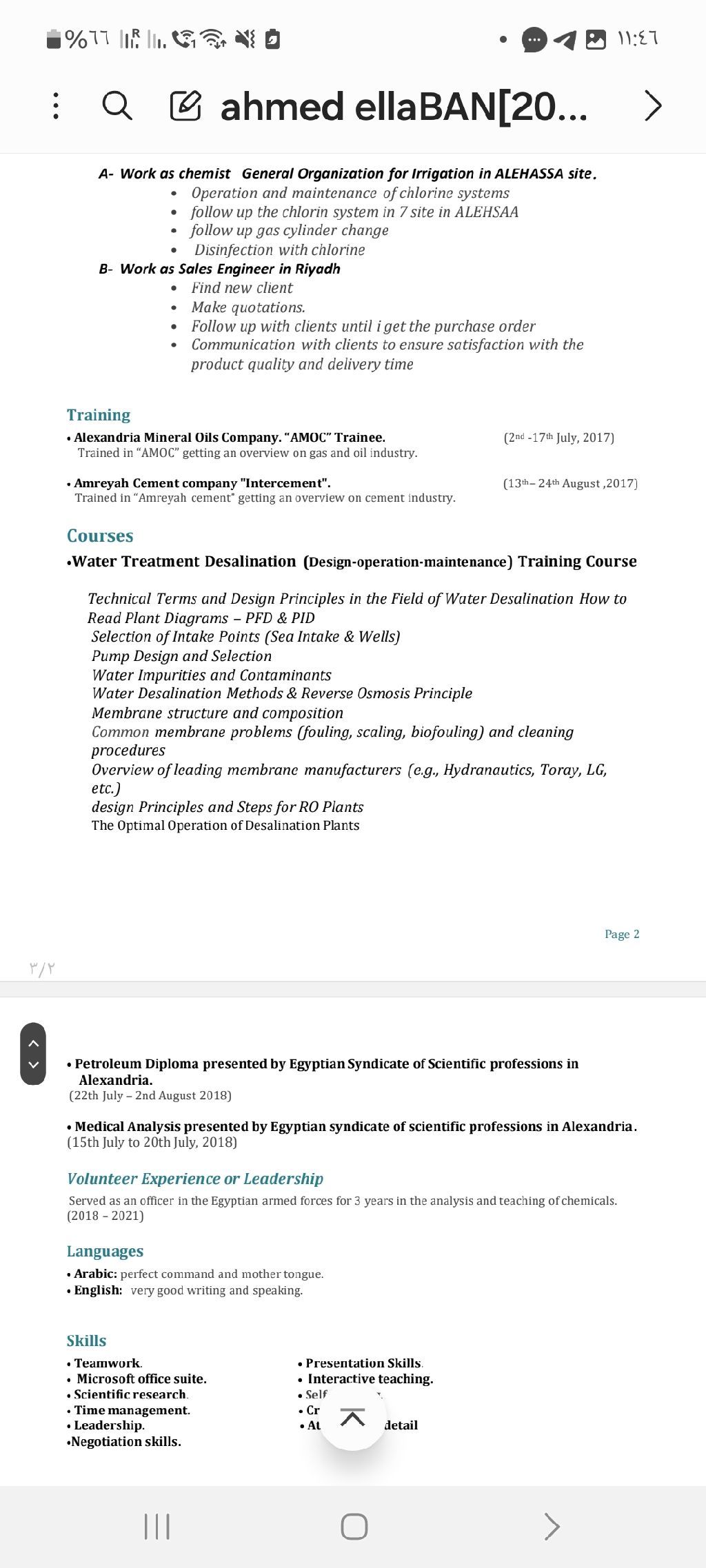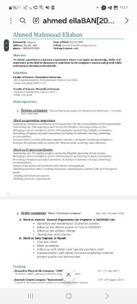I am a Chemistry graduate (Alexandria University, 2018) with experience in water treatment. I worked as a Sales Engineer at Taameed Water Treatment and currently work at NOMAC as a Project Coordinators Supervisor. I also completed a 12 - session Water Treatment course. I am seeking a water treatment position and am ready to relocate anywhere in Saudi Arabia