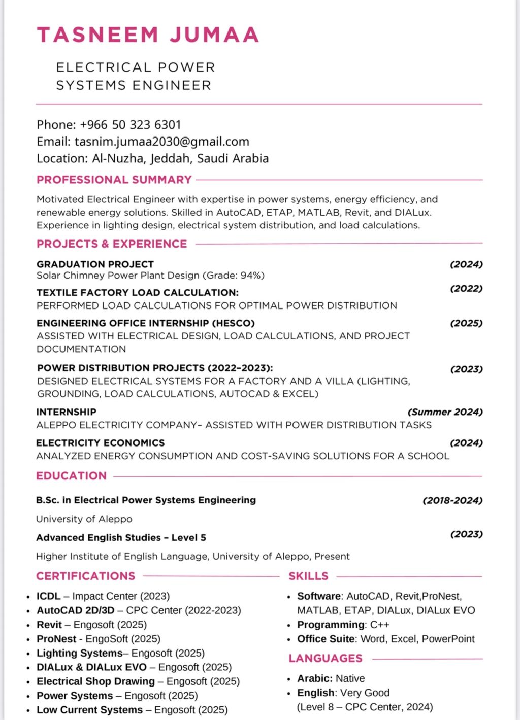 مهندسة كهرباء حديثة التخرج، مقيمة في جدة، المهارات والشهادات بكالوريوس هندسة كهرباء - نظم قدرة. شهادة تدريب من شركة الكهرباء في حلب. خبرة قوية في برنامج اوتوكاد ورسم المخططات الكهربائية بدقة. اعداد جداول الأحمال والمخططات التنفيذية