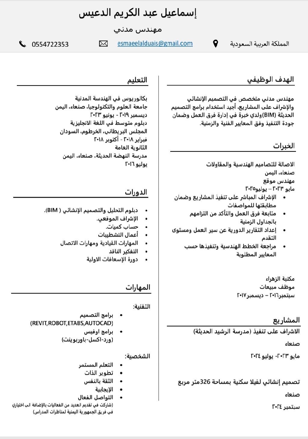 مهندس مدني، اشراف على تنفيذ الأعمال الانشائية والمعمارية، متابعة الجودة وتقدم العمل، التنسيق مع الاستشاري والمقاولين، اعداد التقارير الدورية، حاصل على شهادة (BIM) في التحليل والتصميم الانشائي، ابحث عن فرصة عمل، يوجد لدي رخصة قيادة ومستعد للعمل الفوري في أي مكان داخل المملكة