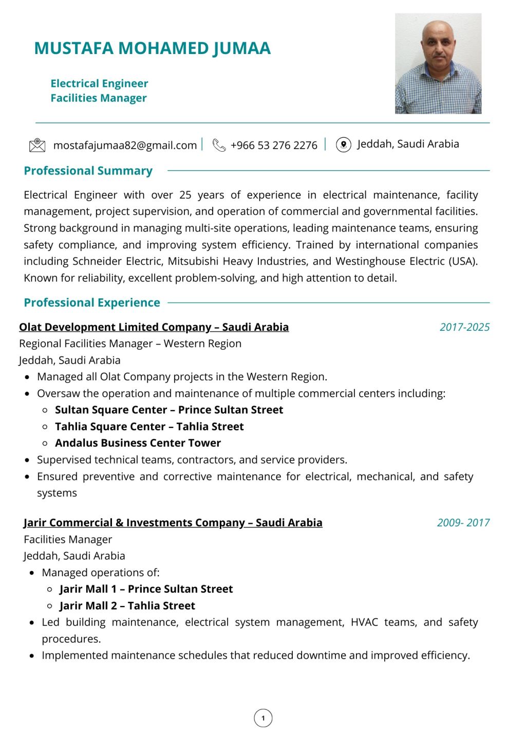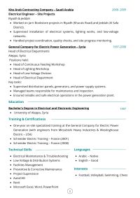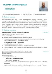 مهندس كهرباء يمتلك خبرة طويلة في ادارة المرافق وتنفيذ مشاريع التمديدات الكهربائية وصيانة الأنظمة الكهربائية والاشراف على مواقع العمل يتميز بالدقة والالتزام بمعايير السلامة، اضافة الى كفاءاته العالية في حل المشكلات وانجاز المهام ضمن الوقت المحدد