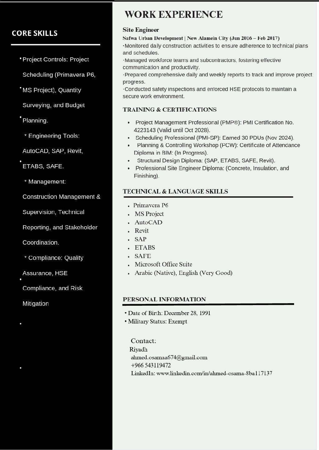 مهندس مدني بخبرة احترافية تتجاوز 9 سنوات في إدارة المشاريع الانشائية والتشطيبات الفاخرة (Luxury Finishing) حاصل على اعتمادات دولية (PMP, PMI - SP, ISO 9001 Lead Auditor) متخصص في التخطيط والجدولة الزمنية الاحترافية باستخدام (Primavera P6, MS Project) مع قدرة عالية على اعداد الخطط الزمنية ومتابعة التدفقات النقدية (Cash Flow) وتقارير الأداء الدوري
