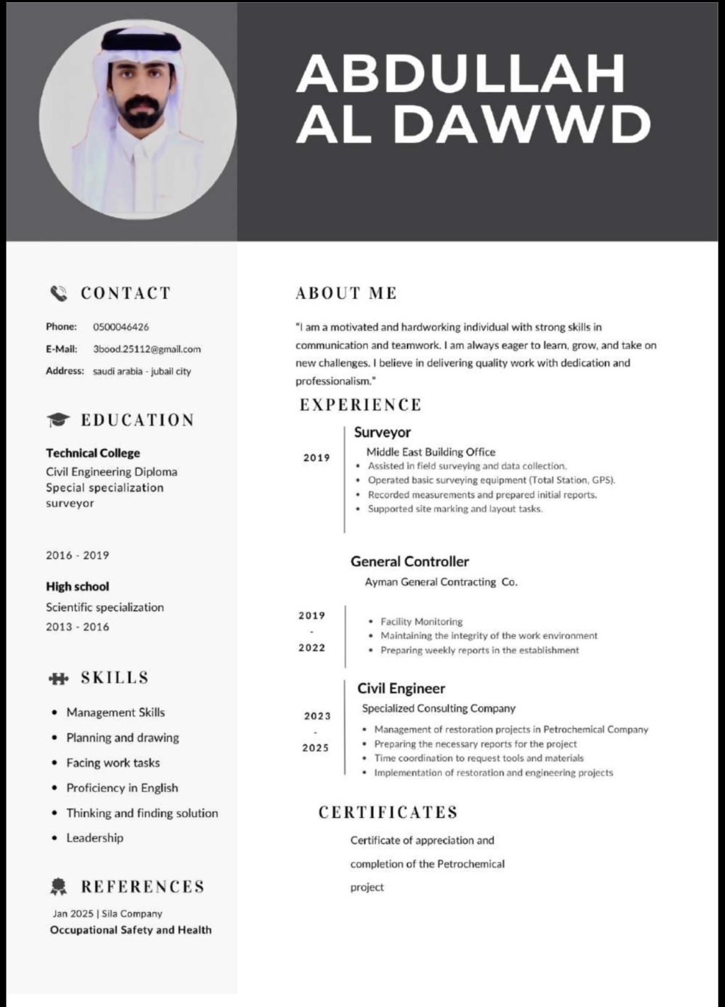 مساعد مهندس مساح لدي خبرة في مجال المسح لمدة 1 سنة ولدي خبرة في مجال الهندسة المدنية بواقع 3 سنوات في مدينة الجبيل الصناعية