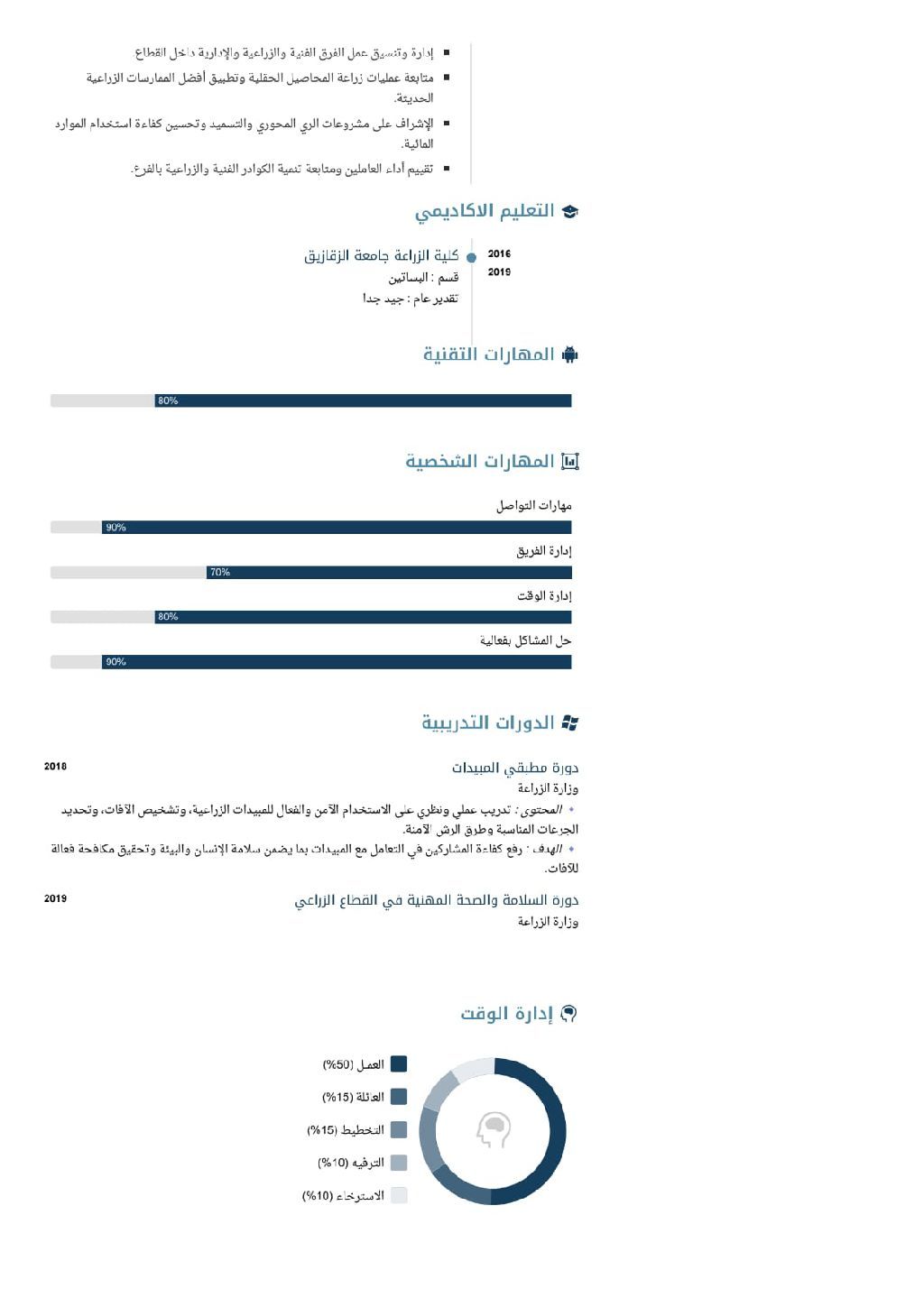 مهندس زراعي خبرة 4 سنوات لدي الشركة الوطنيه لاستصلاح وزراعة الأراضي الصحراوية قسم المحاصيل الزراعية. وسنة في شركة صيانة وتنسيق الحدائق وأعمال التشجير. إدارة المشاريع الزراعية ومتابعة التنفيذ