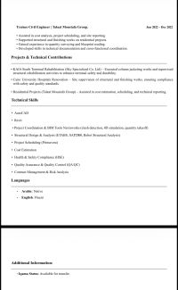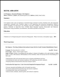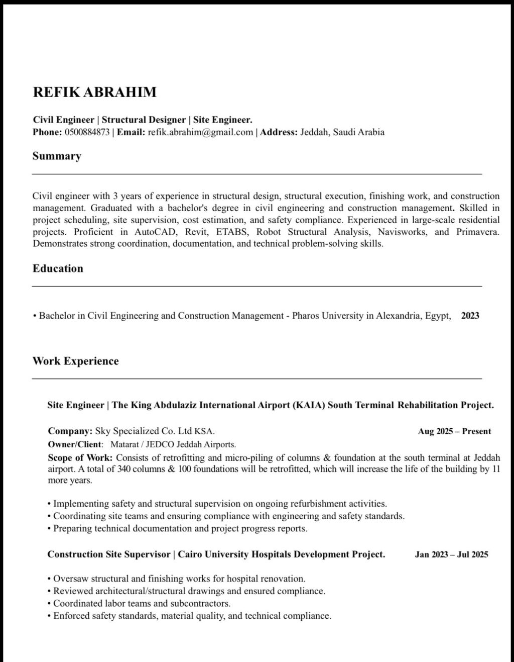 مهندس مدني في جدة. خبرة 3 سنوات في التصميم والتنفيذ الانشائي وجدولة المشاريع ذات النطاق الواسع. إقامة قابلة للنقل
