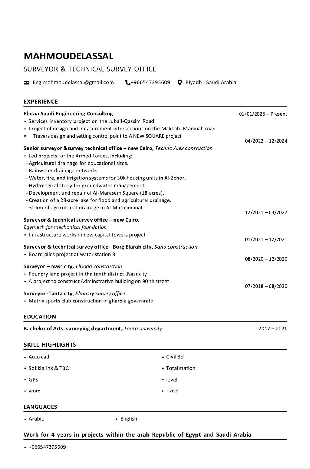 General surveyor Five years of experience. seeking employment and ready to start immediately