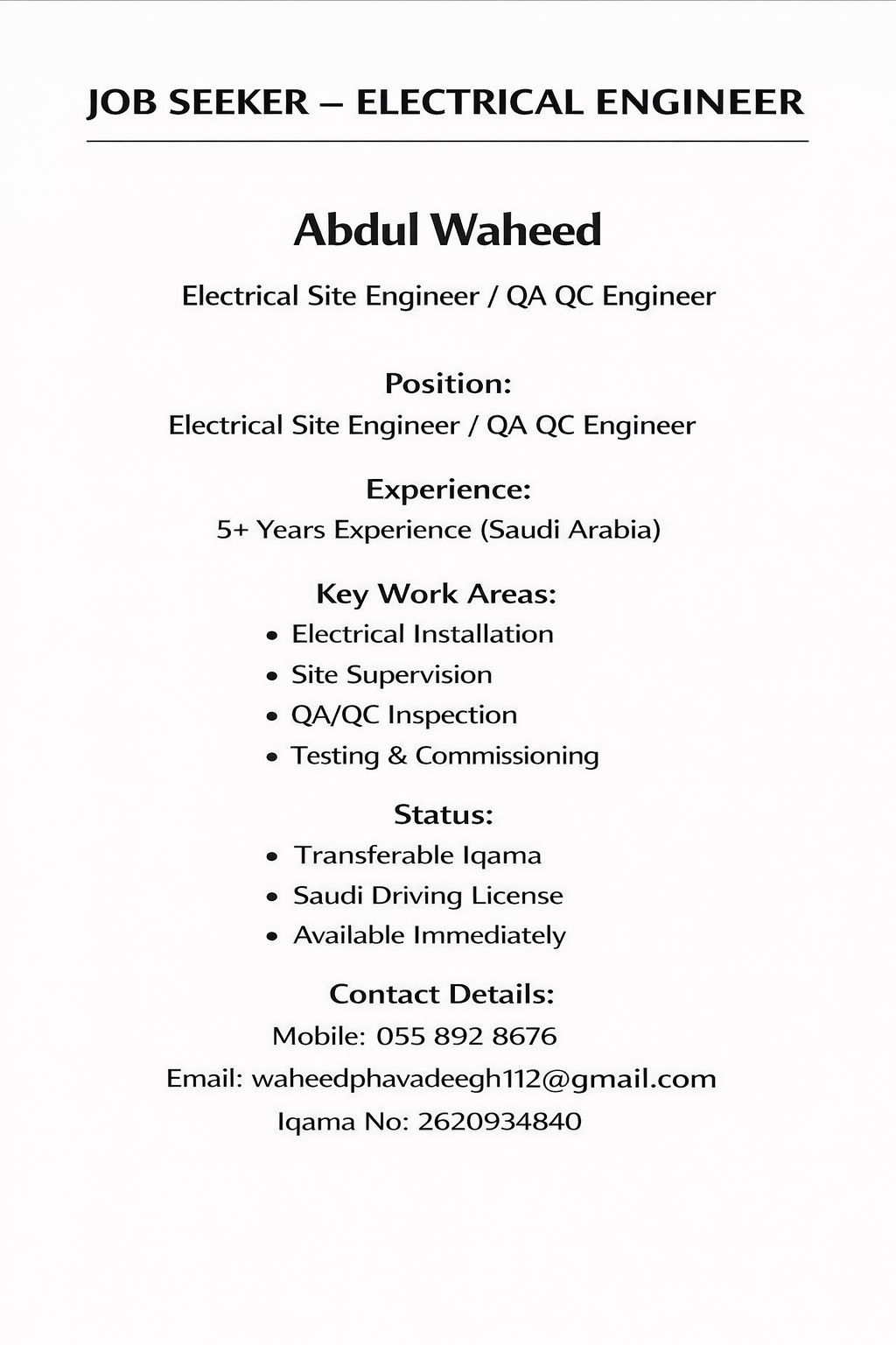 Electrical Engineering professional with 5 years of site - based experience in construction projects. Currently located in Jeddah and open for immediate hiring. I hold a transferable Iqama and a valid Saudi driver’s license. Experienced in handling site documentation, supporting electrical installations, coordinating daily site requirements, and ensuring compliance with safety and technical standard