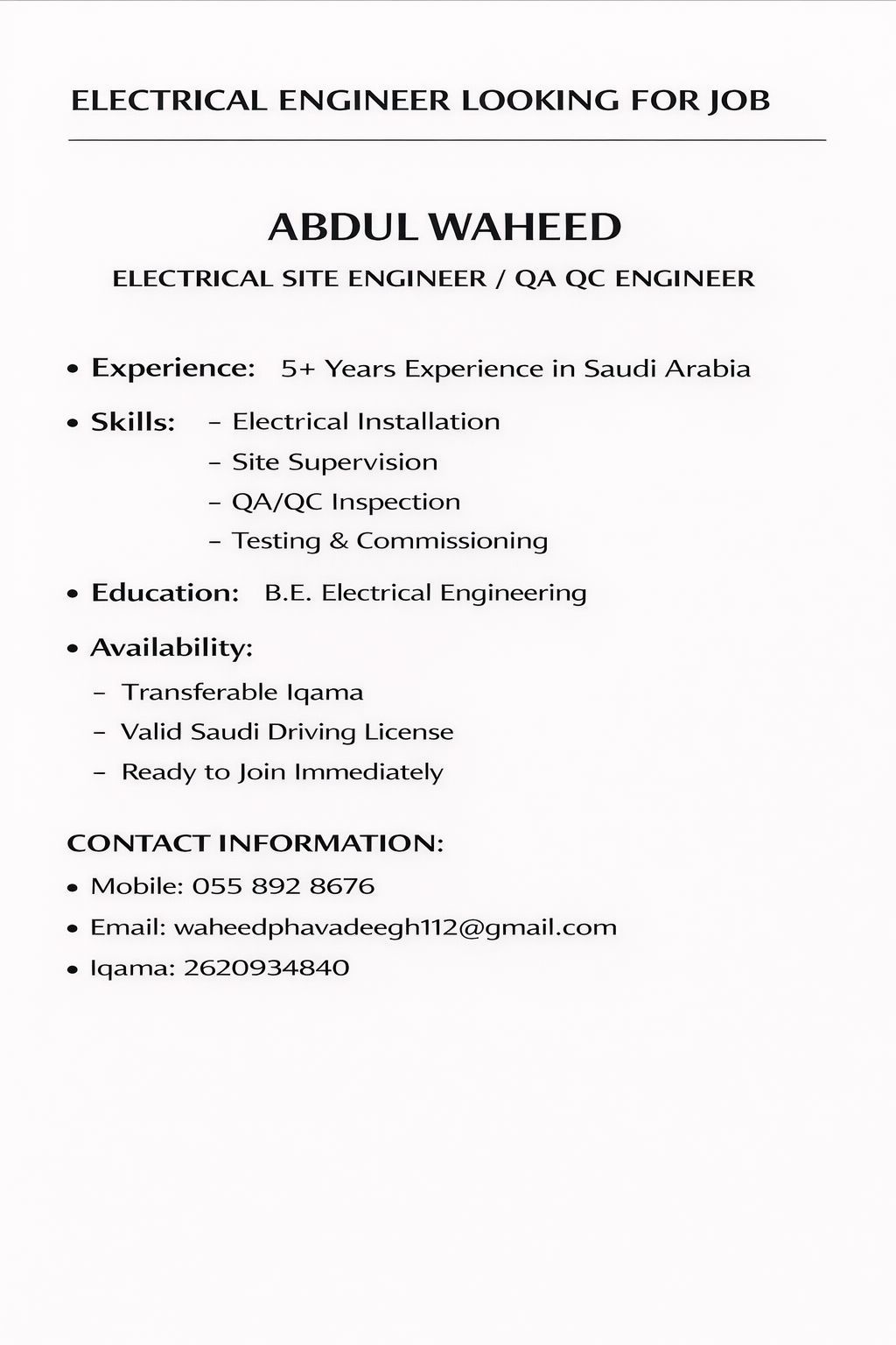 Site Electrical Engineer with 5 years of experience working directly on construction sites and supporting project delivery. Currently based in Jeddah and available for immediate employment. I hold a transferable Iqama and a valid Saudi driver’s license. Experienced in following site instructions, assisting execution works, monitoring quality, and coordinating daily activities. Responsible, flexibl