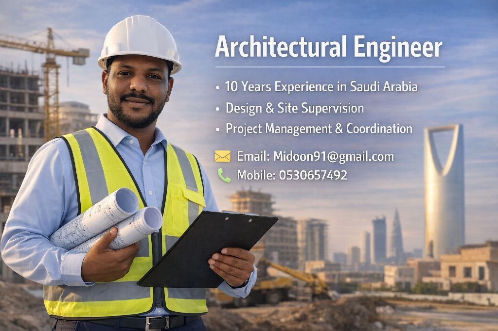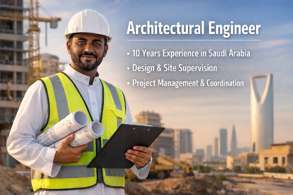 Architectural Engineer with 10 years of experience in Saudi Arabia. Worked as an Architect, Designer, Project Manager, and Technical Office Engineer. Experienced in design and site execution of various projects, with strong knowledge of drawings, coordination, and project delivery from start to