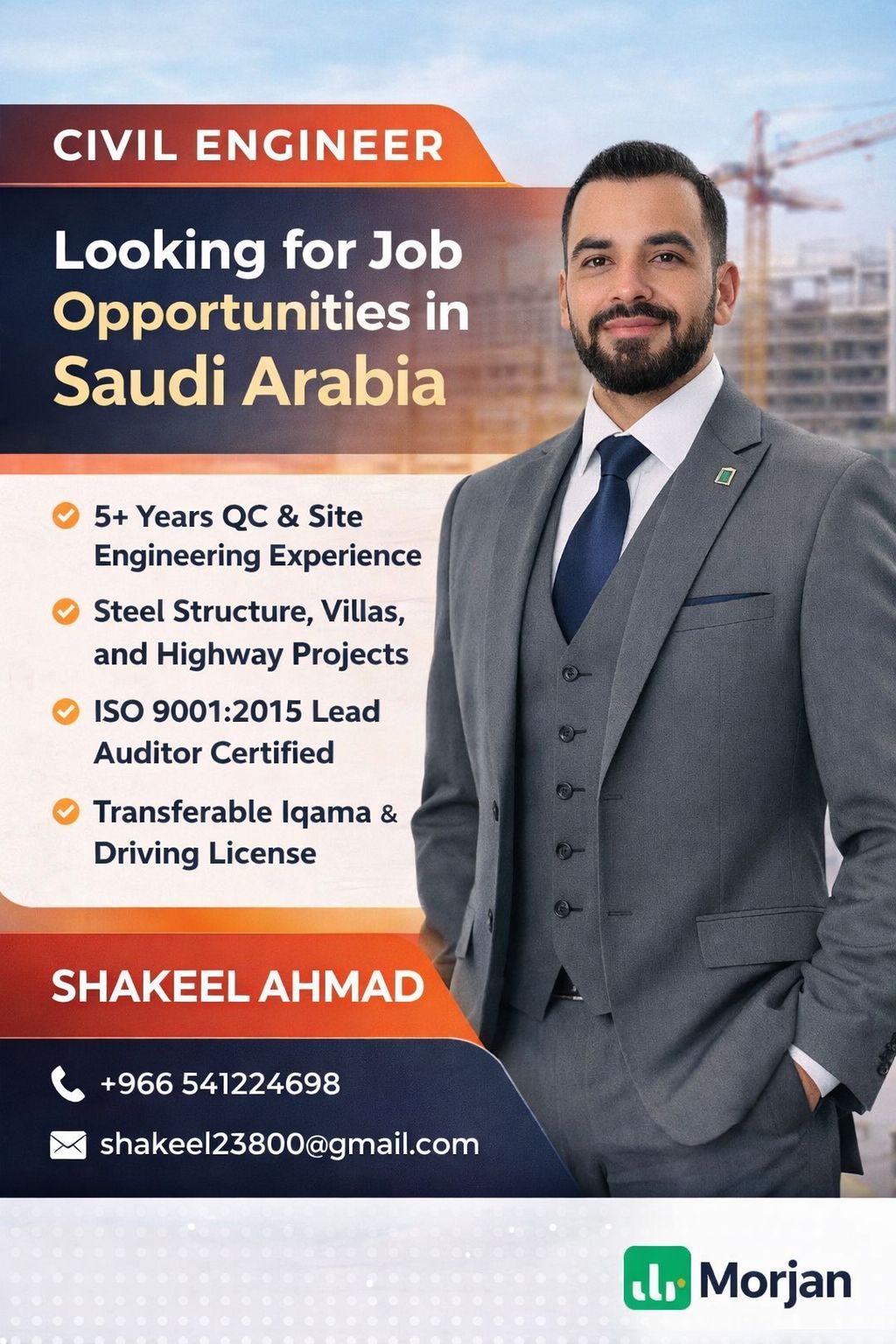 Experienced Civil Engineer with over 5 years of QC and Site Engineering experience in Saudi Arabia. Currently working on a multi - story steel structure factory project in Riyadh. Skilled in steel structures, villas, highways, inspections, testing, and documentation. ISO 9001:2015 Lead Auditor certified. Holding transferable Iqama and valid Saudi driving license. Available for immediate joining