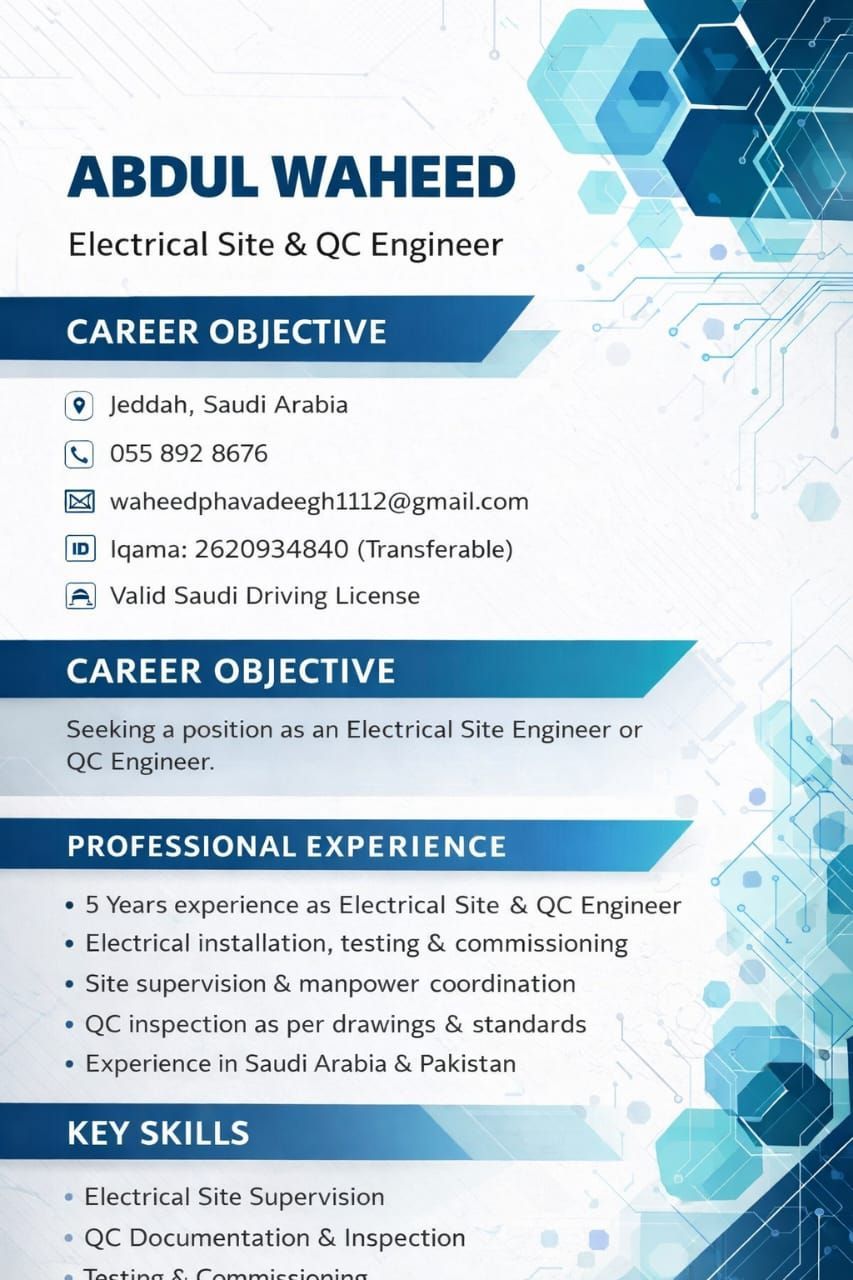Construction Site Engineer with 5 years of experience supporting electrical works and managing site - related activities. Currently based in Jeddah and available for immediate hiring. I hold a transferable Iqama and a valid Saudi driver’s license. Skilled in assisting site execution, coordinating daily tasks, checking compliance with drawings, and maintaining safe working conditions. Practical, deta