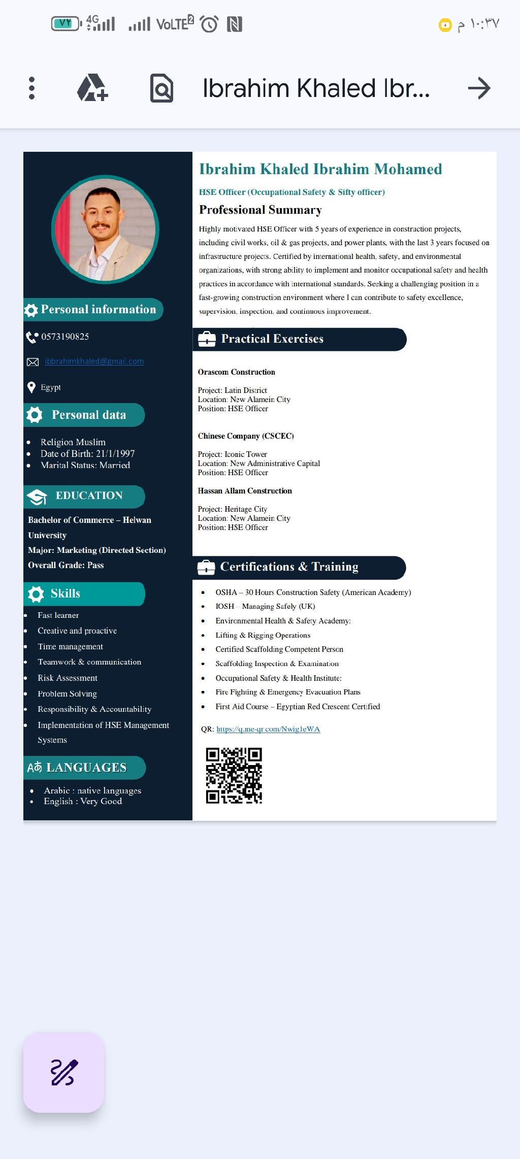 Occupational Safety and Health Officer with five years of experience in construction sites, holding OSHA Construction, OSHA Industrial, and British IOSH courses, as well as first aid from the Red Crescent, fire fighting, and evacuation plans