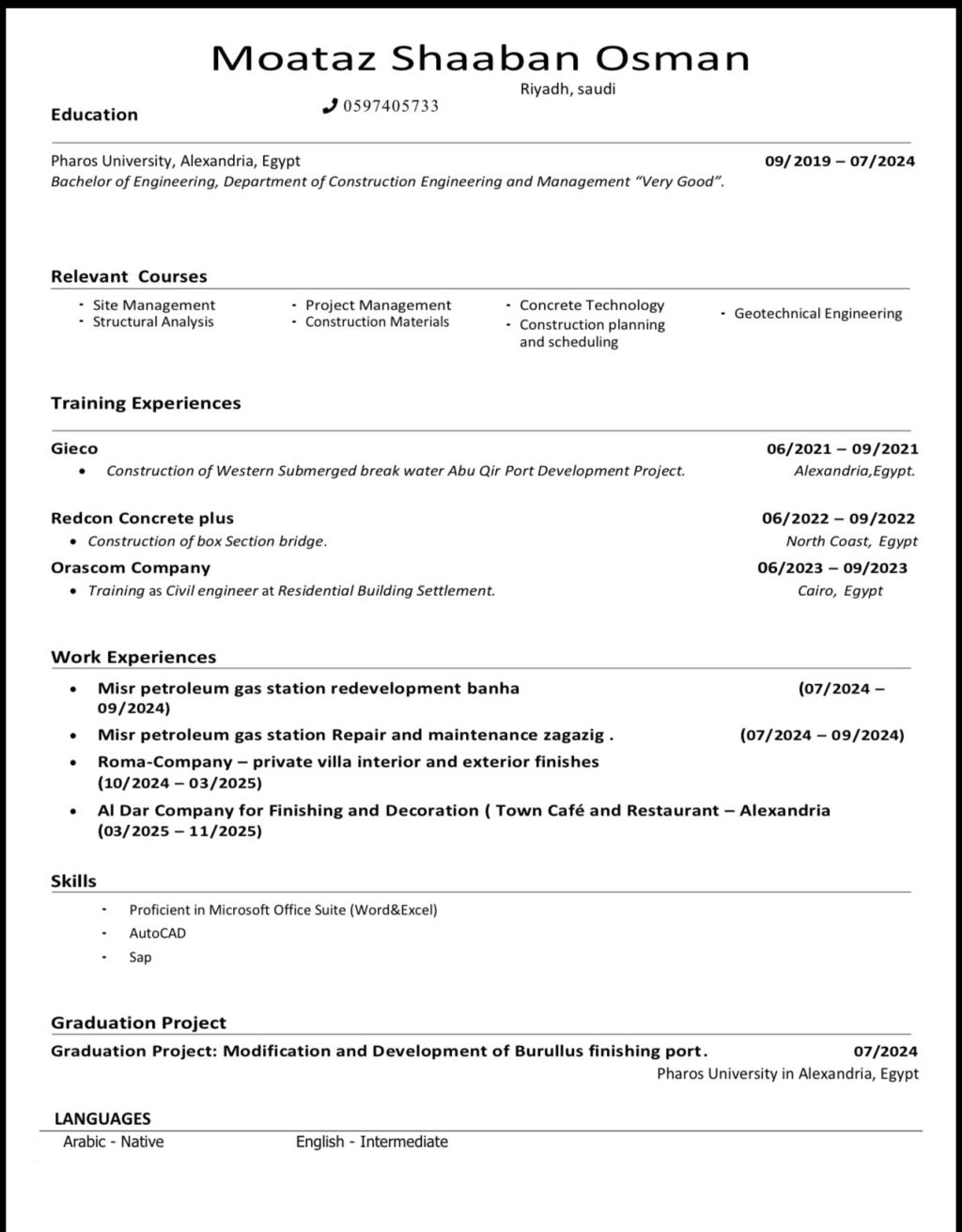 مهندس مدني مصري الجنسية خبرة سنتين خبرة في أعمال التنفيذ والخرسانات والتشطيبات والترميم واستلام كافة البنود الانشائية والمعمارية وفقا للواحات الهندسية التصميمية وعمل تنسيق بين الاستشاري والمالك وعمل التقارير اليومية والأسبوعية ومتابعة الجدول الزمني وتقديم المقترحات اللازمة. ابحث عن فرصة عمل كمهندس مدني موقع في جميع أنحاء المملكة العربية السعودية